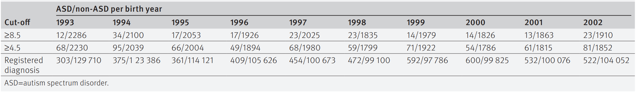 The first piece of data comes from Table 1. This table has the numbers of people in the population-representative Child and Adolescent Twin Study in Sweden (CATSS), alongside the numbers of them who have passed certain thresholds on the Autism-Tics, ADHD and other Comorbidities (A-TAC) inventory and numbers of people in the National Population Register (NPR) who had obtained an autism diagnosis.