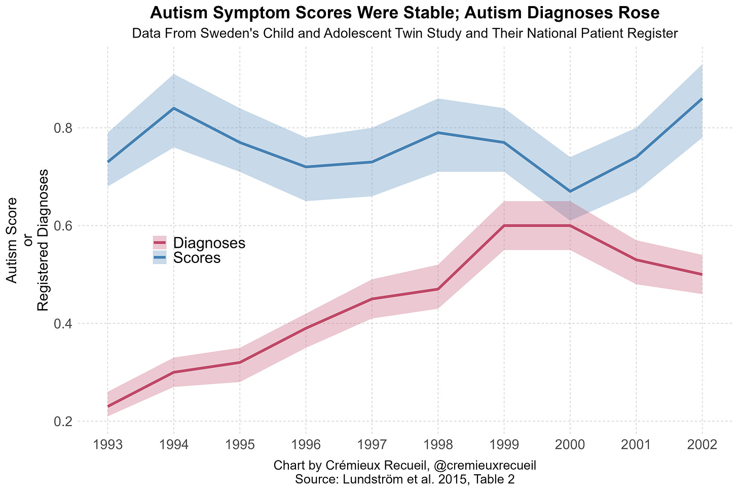 We have exactly the required data courtesy of Lundström et al.’s 2015 BMJ study of the prevalence of autism in Sweden between 1993 and 2002.