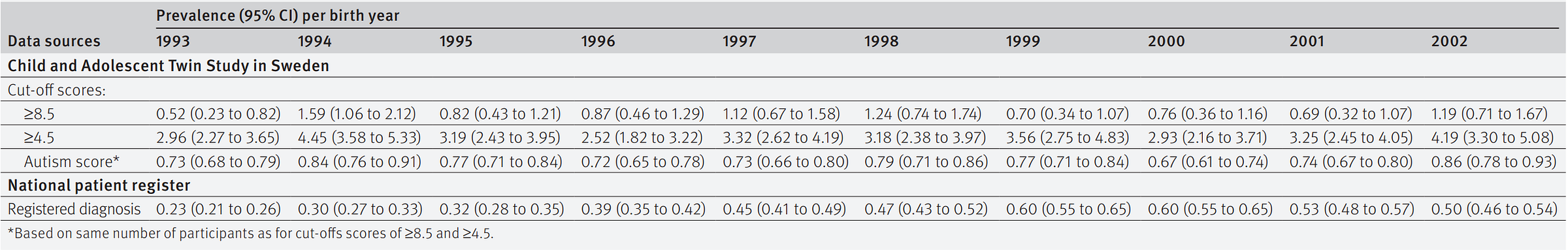 Parents of twins born during 1993-95 were interviewed when the twins were 12 years old, and those born during 2000-02 only had 7-9 years of follow-up in the national patient register. As a consequence there was a seeming decrease in the annual prevalence of autism spectrum disorder for those born in 2000-02. However, when only including those who had been registered with a diagnosis in the national patient register before the age of 7 years, and thus having had exactly the same length of follow-up, a monotonic increase from 0.07% (1993) to 0.43% (2002, P<0.001) was observed. [Emphasis mine.]