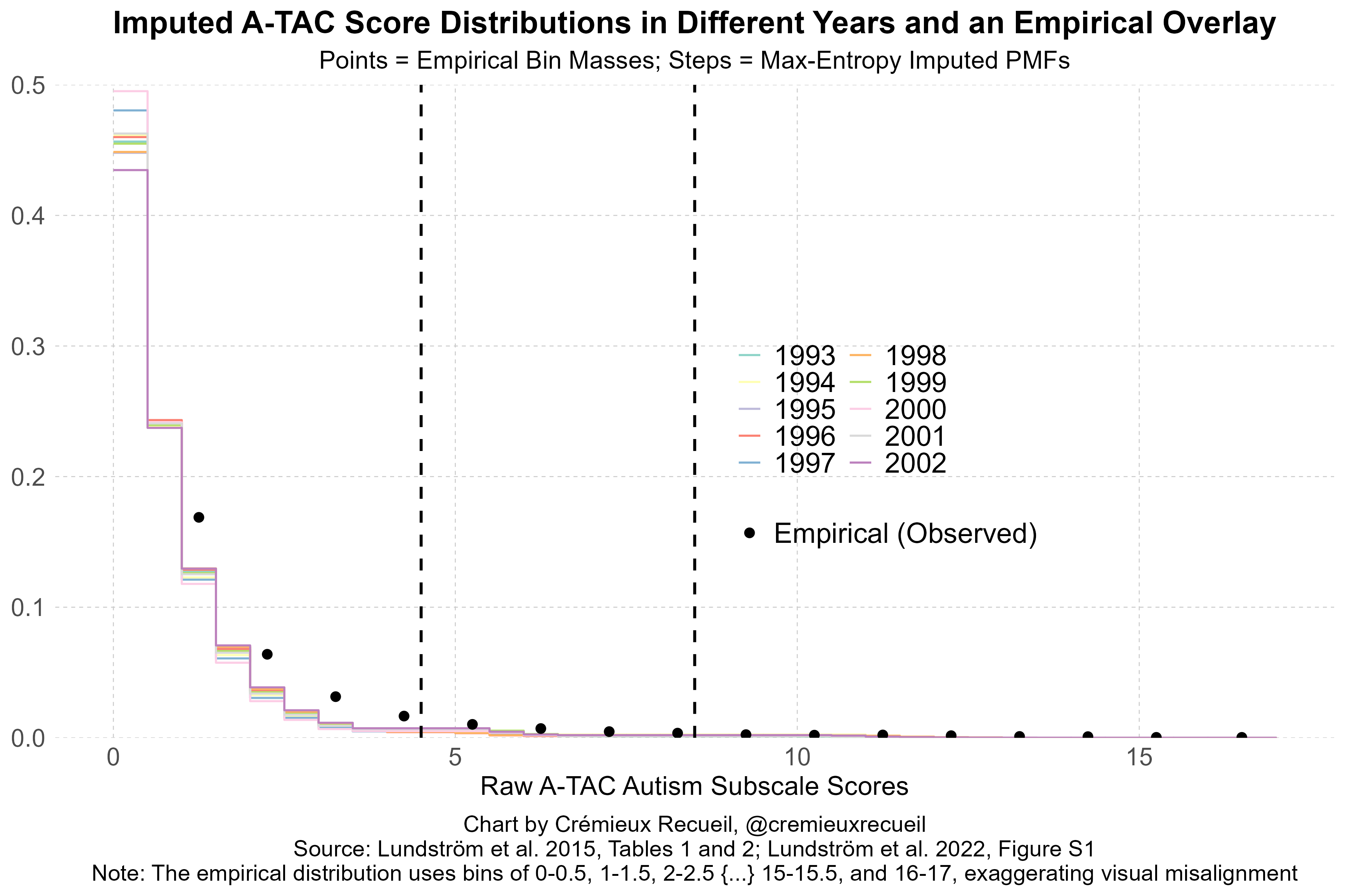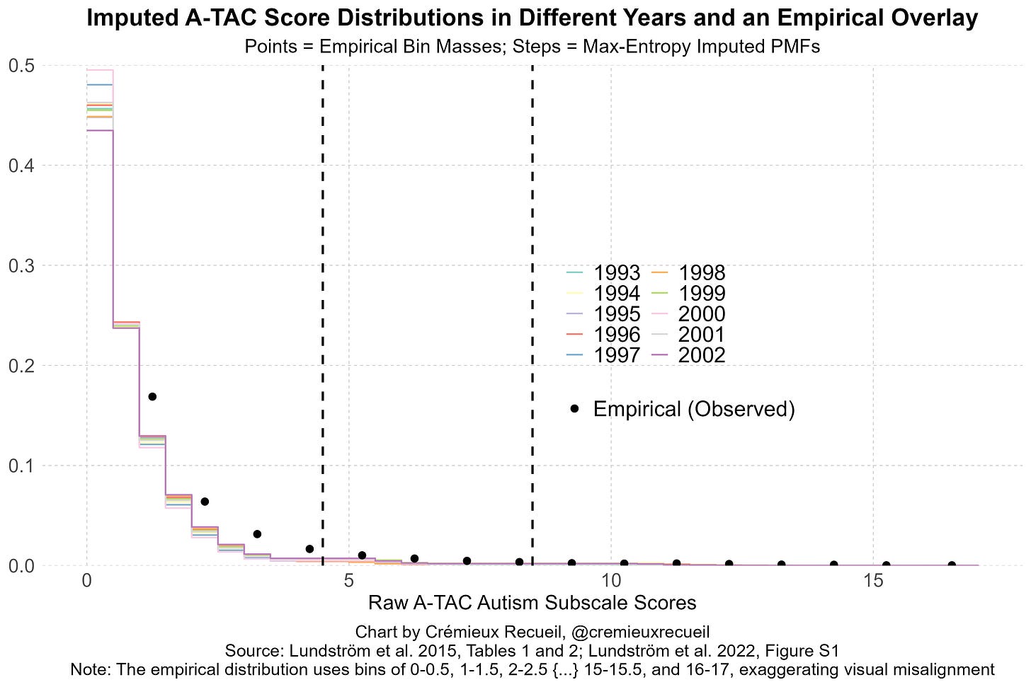 We have two tail counts from the CATSS dataset, the score mean and 95% CIs, and registered diagnostic prevalences from the NPR, we just need to handle the ascertainment issue where the sample’s last assessment year is 2009, so some of the kids included in it are too young to have been diagnosed at the same ages as those in earlier years. As the authors noted:
