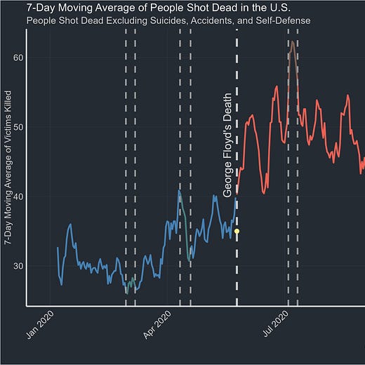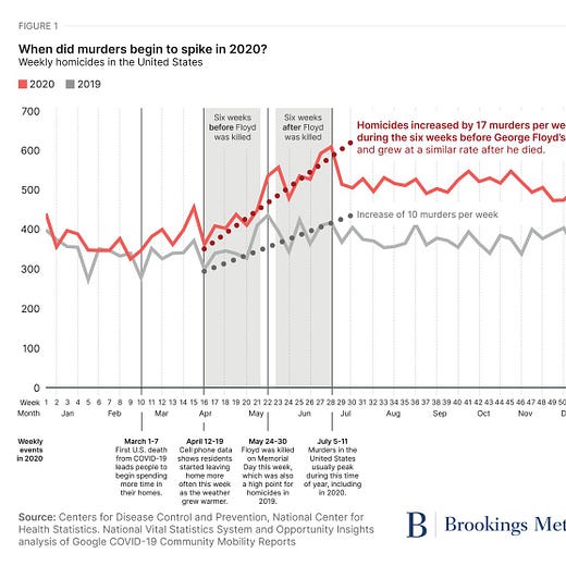 On the subject of the Floyd effect, many have engaged in valiant attempts to deny that it had anything to do with George Floyd’s death—to deny that there’s even a Floyd effect to speak of! The most popular example came from Brookings, and it was embarrassingly bad and worth of retraction.