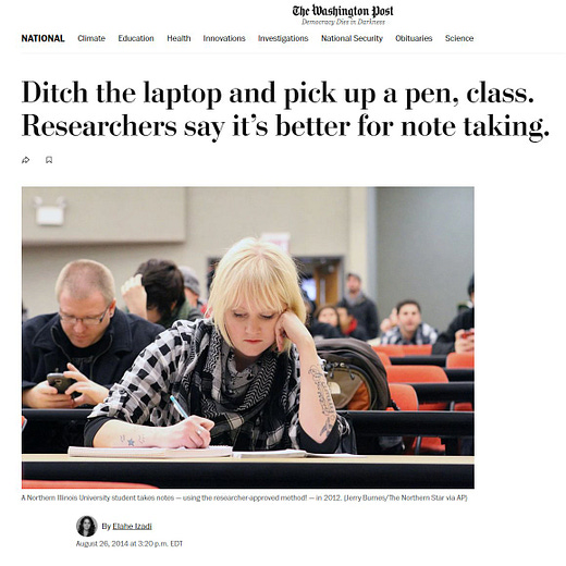 Speaking of Brookings, they have published many errant reports. Another that I’ve critiqued before was on laptop versus longhand note taking. To be fair to Brookings, they weren’t alone in picking up these results, nor were they alone in their credulity.