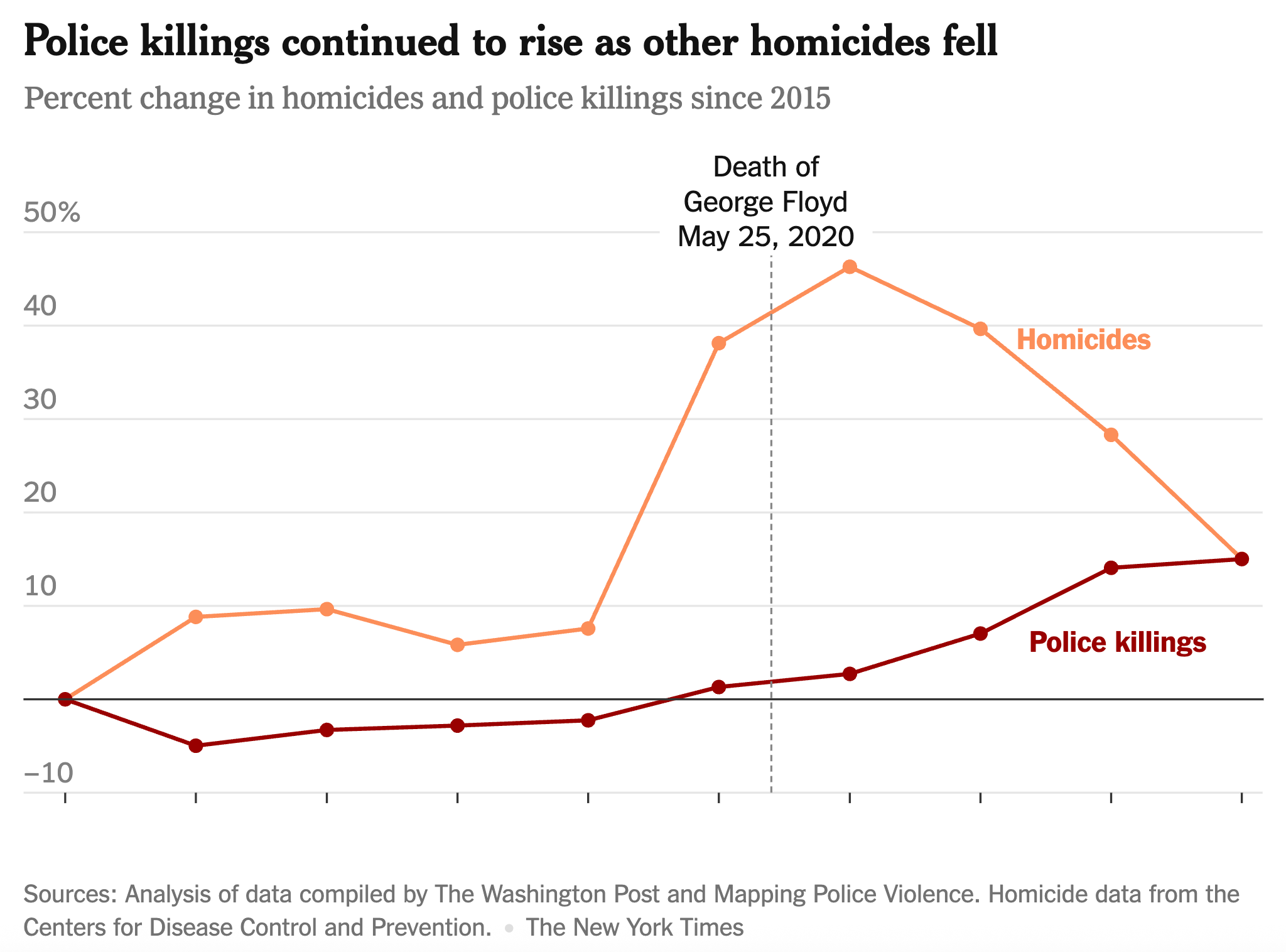 The issue here is that it looks like the rise in homicides happened when 2020 started, rather than during 2020. This is entirely due to the annual-level aggregation the authors chose. As it happens, the rise occurred on the day George Floyd died—hence why the rise in homicides has come to be known as the “Floyd effect.” But because all of 2020 is bundled together in the NYT’s chart, it appears as though Floyd’s death was irrelevant. This is a very misleading chart, and the sort of error that should be noticed and pointed out, even though astute readers shouldn’t be fooled by it. The reason this should be pointed out has to do with the fact that astute readers also can’t be informed by it: they cannot help but notice that the Floyd line is uninformative, but they also can’t be informed about the timing of the homicide hike within 2020. It is a chart that will mislead many, and it can’t inform people who it doesn’t fool either! That it puts police killings (rare) and homicides (less rare) on the same scale doesn’t help and might be notable, but isn’t a crucial weakness, so I wouldn’t critique that aspect.