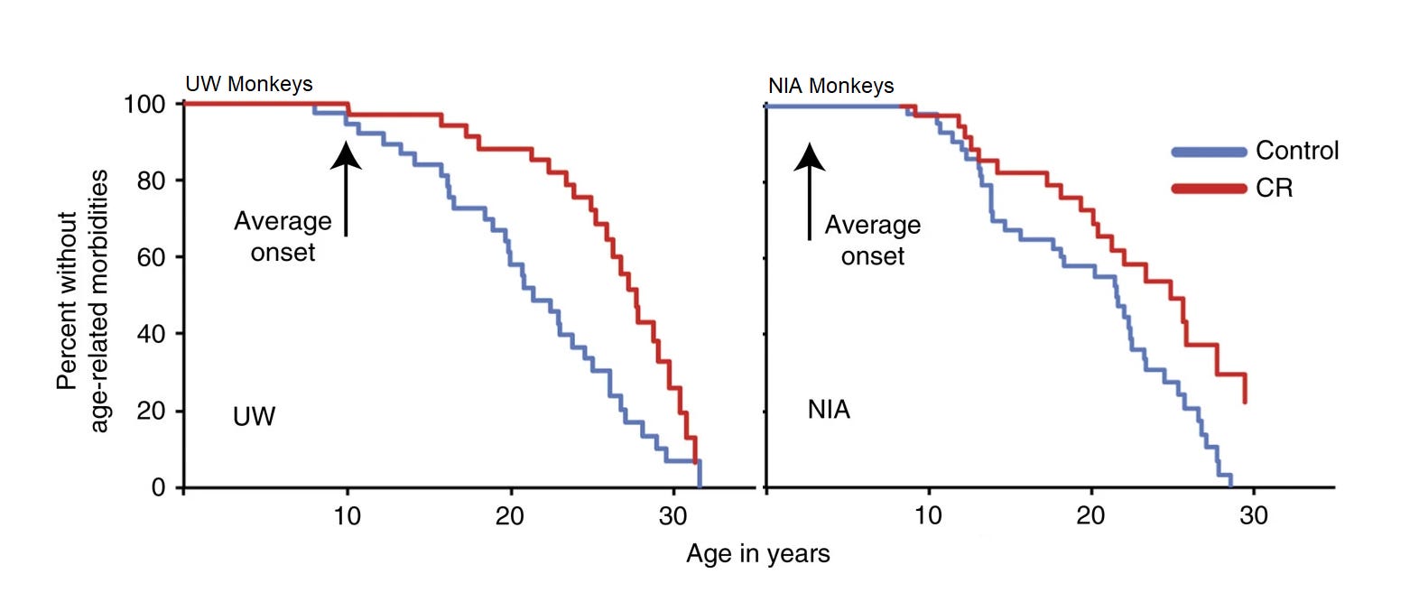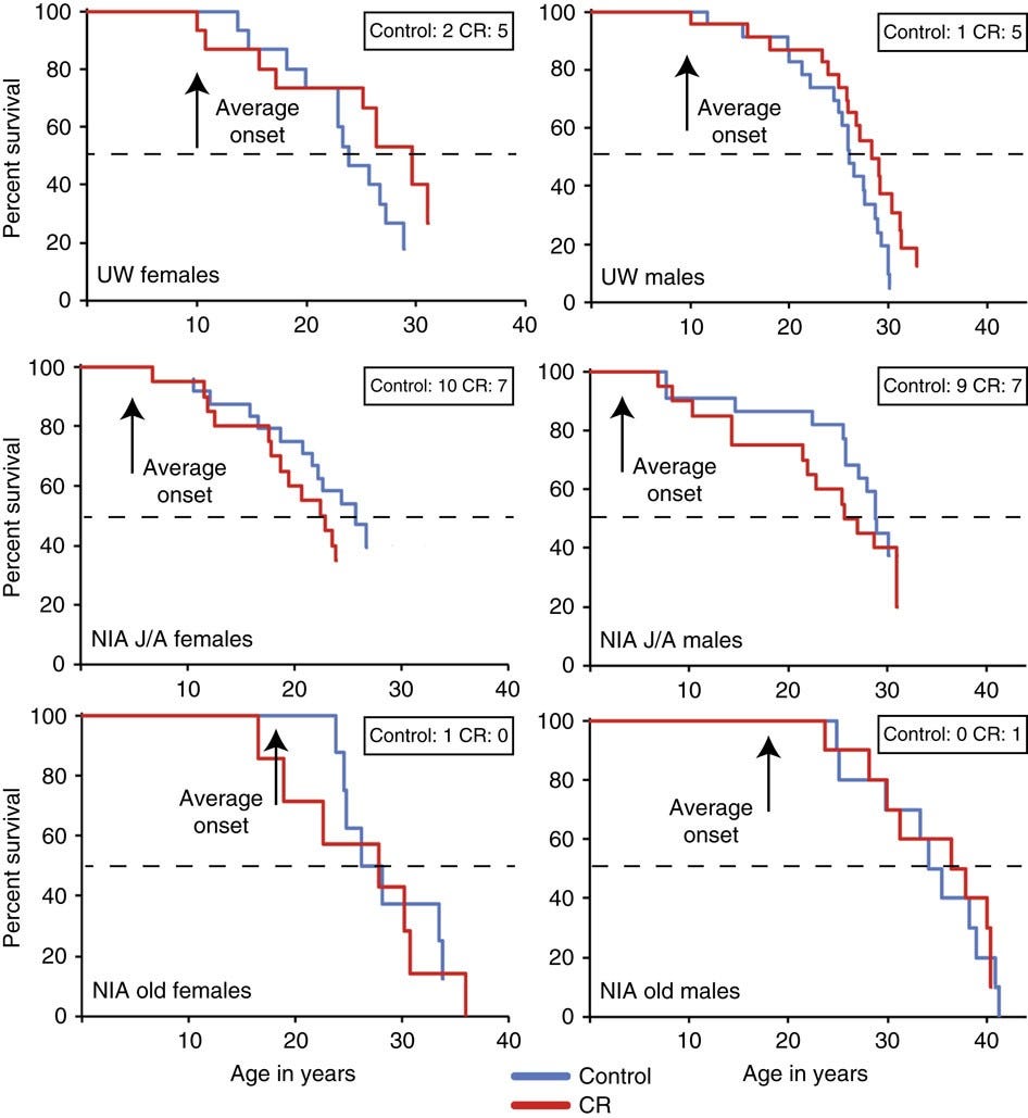 It seems logical that improved age-related morbidity would result in longer survival, but this is not something that can be assumed even if it seems likely. It might be something that’s observed at very large sample sizes, but these studies had only modest sample sizes. The UW study had 23 male control-CR pairs and 15 female ones, whereas the NIA study had 10 old and 10 juvenile male pairs along with a set of 12 male control and 10 male CR adolescents, with 9 pairs of juvenile females, 15 female control and 11 female CR adults, and for the old, they had 8 female controls and 7 female CR monkeys.