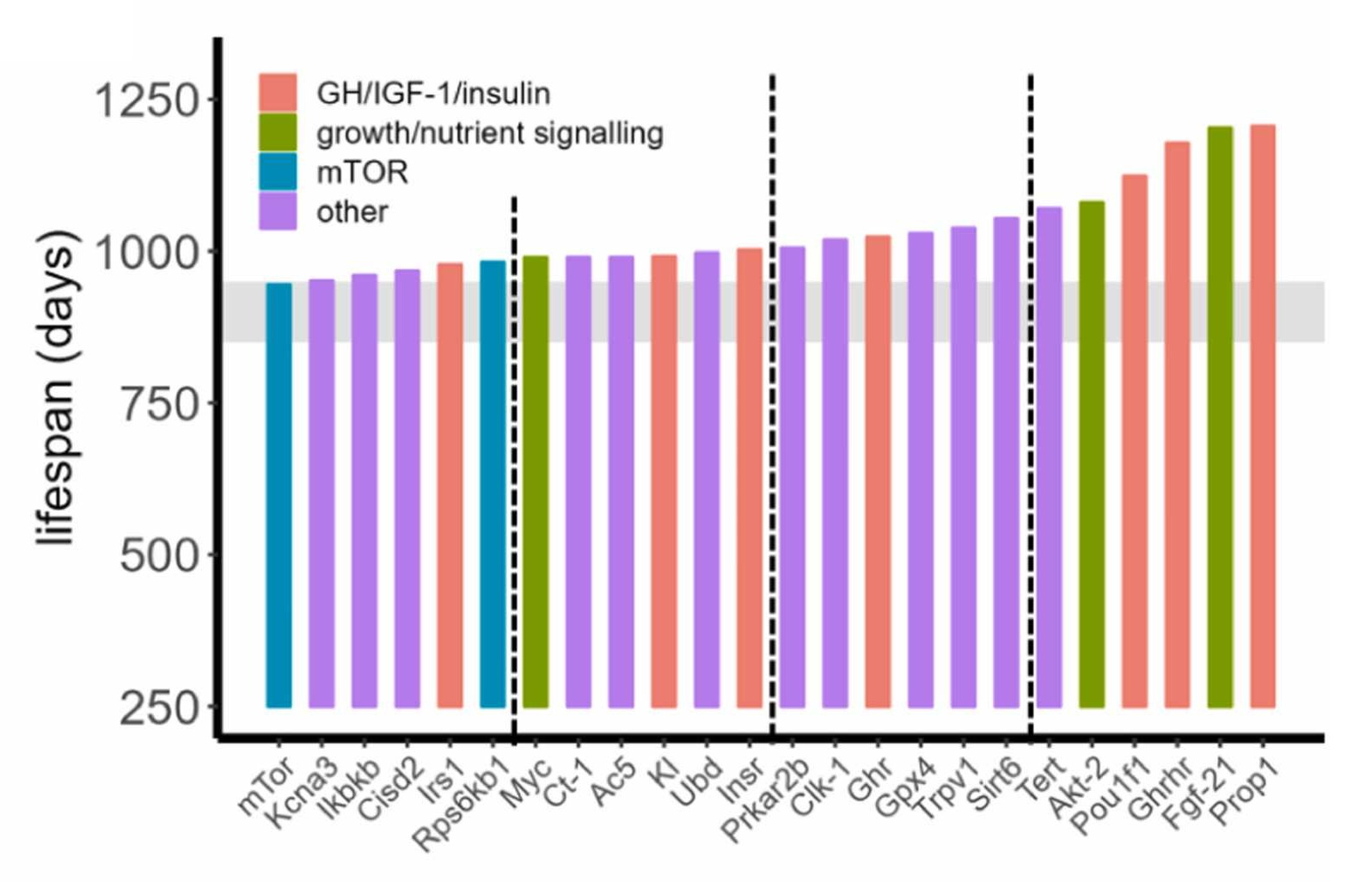 The shaded area you see in this diagram corresponds to a lifespan of between 850 and 950 days, and it corresponds to Pabis et al.’s suggested method to validate longevity treatments in mouse models: use a 900-day rule. This rule—the number of which should be adjusted based on the animal—holds that a longevity treatment “passes” if we see any significant lifespan intervention while control lifespan is 850-950 days, or, failing that, if the final median lifespans of the treated group are ≥950 days.