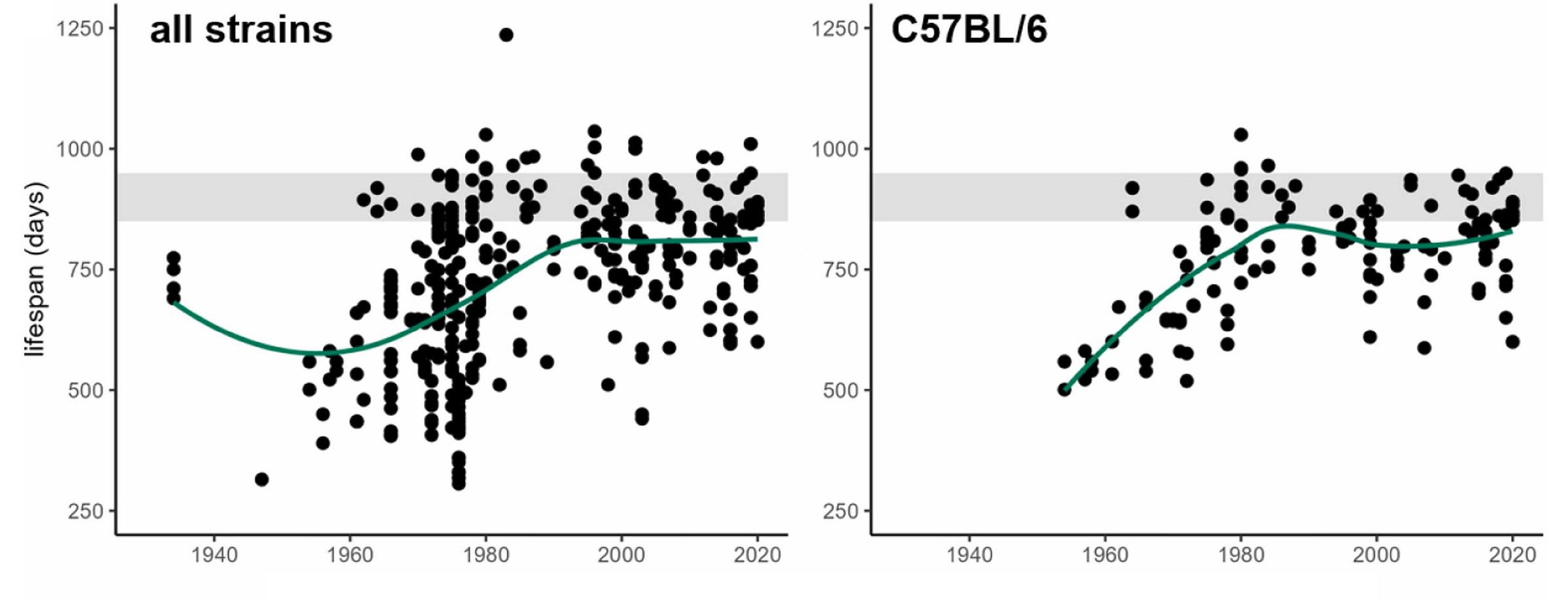 The fact that short-lived strains are desirable for research because they allow it to go faster has polluted the literature because short-lived, convenient-to-research strains produce unreliable results for the very reasons behind their being short-lived. Pabis et al. therefore argued that, in order to demonstrate longevity benefits credibly, strains with long control lifespans in optimal conditions are needed. Luckily, in the late-1970s and early-1980s, improved animal husbandry and environmental quality raised a number of different mouse strains’ lifespans to a plateau of around 800 days.