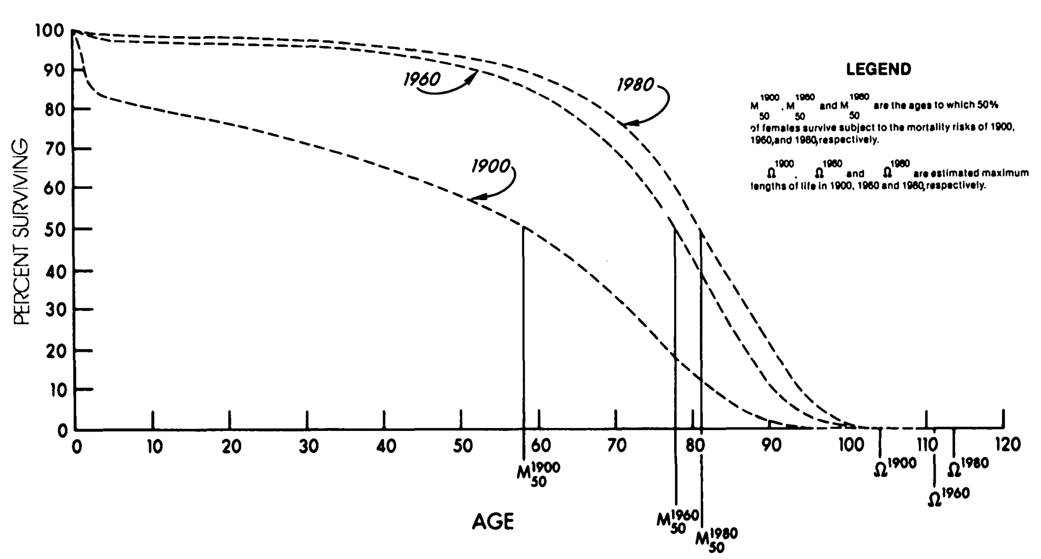 Globally, people today live longer than ever before due to mortality improvements at all ages. The largest gains have been to child mortality, whereas at the top end, the gains have been much smaller. In effect, survival curves look increasingly rectangularized, like so: