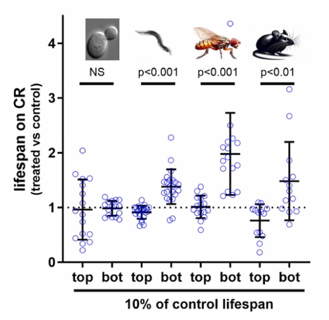 Pabis et al.’s study looked at the treatment effect of caloric restriction on lifespan for mice, flies, worms, and yeast, and found that, in yeast, there was no benefit, and across the other three species, caloric restriction only had benefits outside of the longest-lived strains. In fact, in the top decile of strains by lifespan, there didn’t seem to be any longevity benefit to caloric restriction. Across species, there were substantial negative correlations between control lifespans and the benefits of caloric restriction.