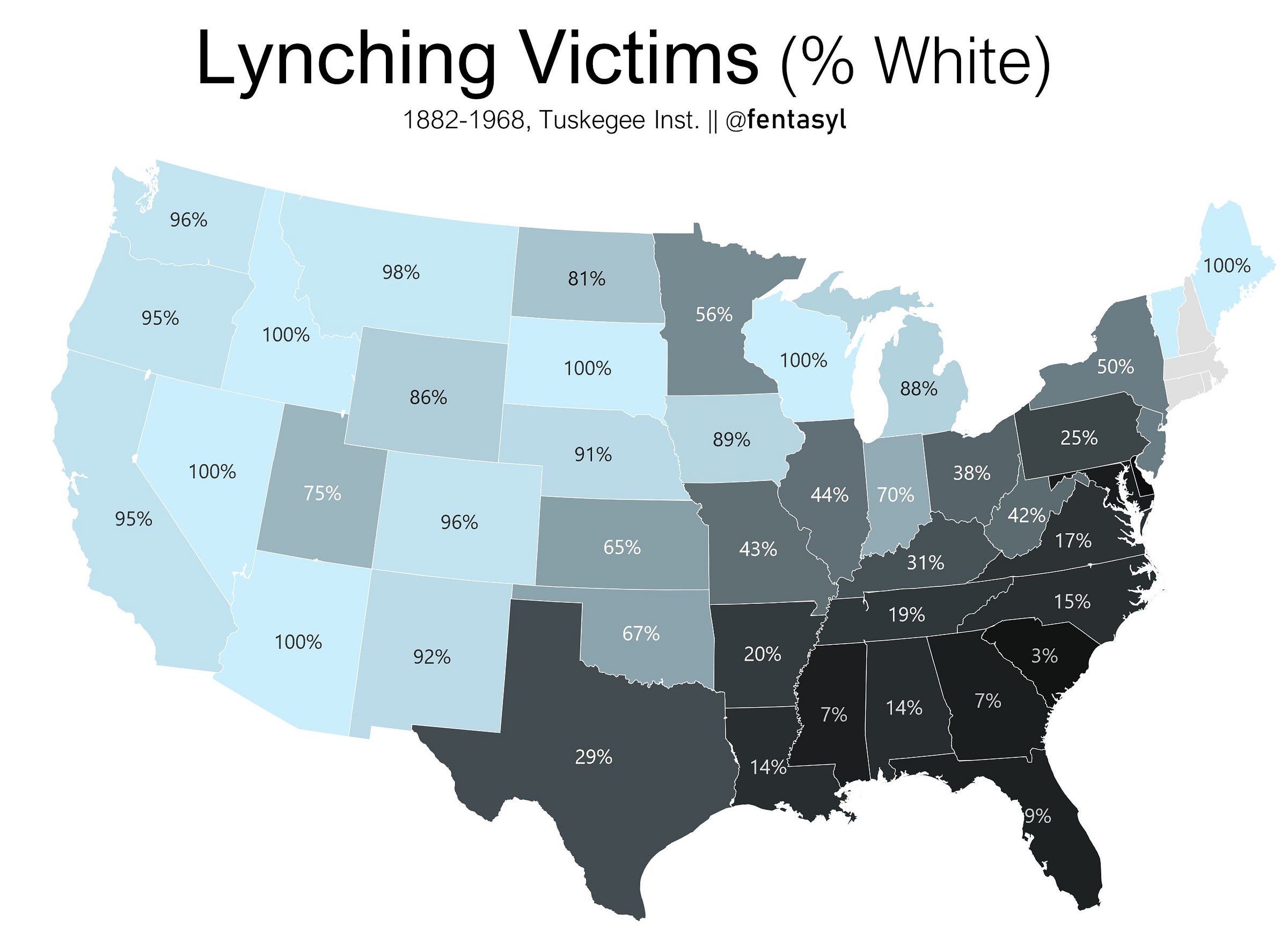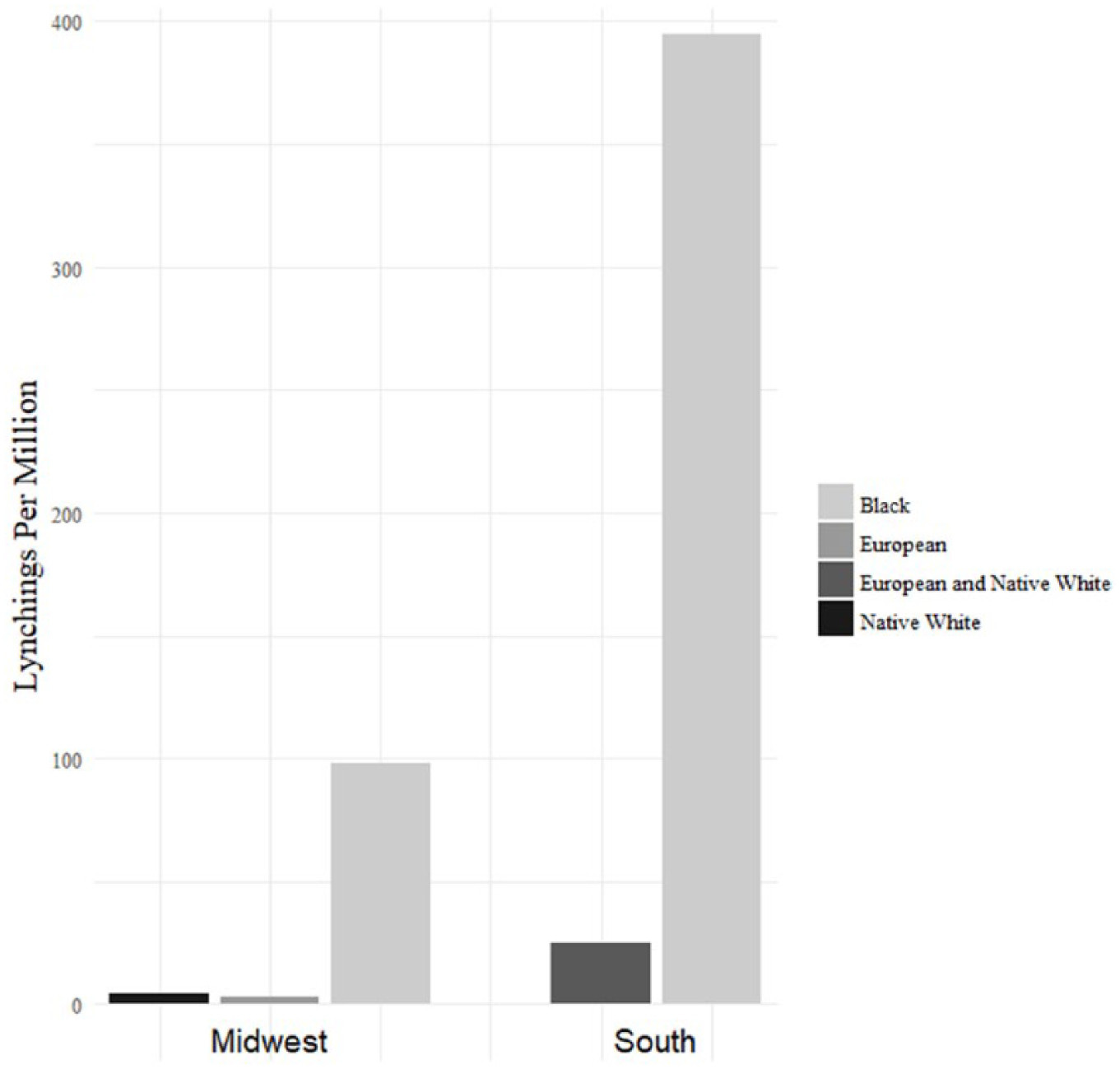 The South received relatively small numbers of immigrants, so lynchings of European immigrants in that region were thrown together with lynchings of other Whites. In the Midwest, data was available to distinguish between the two groups of Whites, and there we can clearly see that European Whites were not particularly notable targets for lynching.