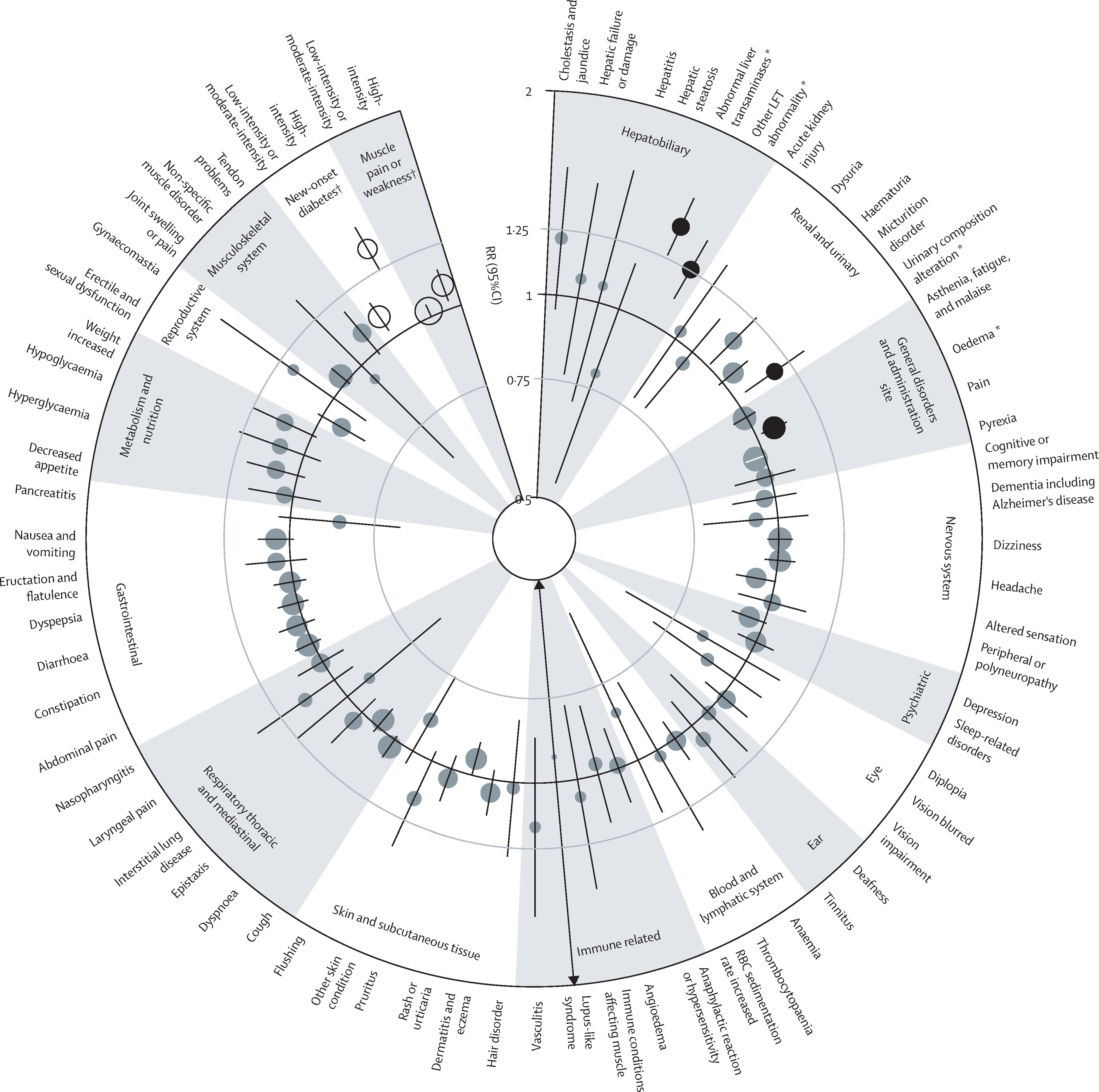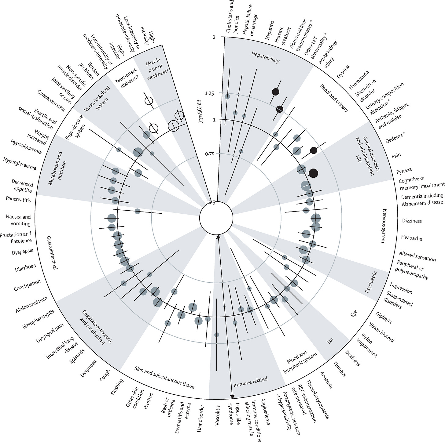 If you can’t tell, there is not a single clinically-meaningful effect size pictured in that ring. Moreover, almost every result is null, and given that they almost all cover a very limited range, they are almost all very precise nulls.3 The largest positive effect—meaning one in which statins lead to side effects—is equivalent to about r = 0.10 or d = 0.19. It’s practically nothing, and, as the authors have noted elsewhere: “any theoretical adverse effects of statins on cardiovascular risk that might arise from [their side effects] (or, indeed, from any other mechanism) are already accounted for in the overall reduction in cardiovascular risk that is seen with statin therapy”.4