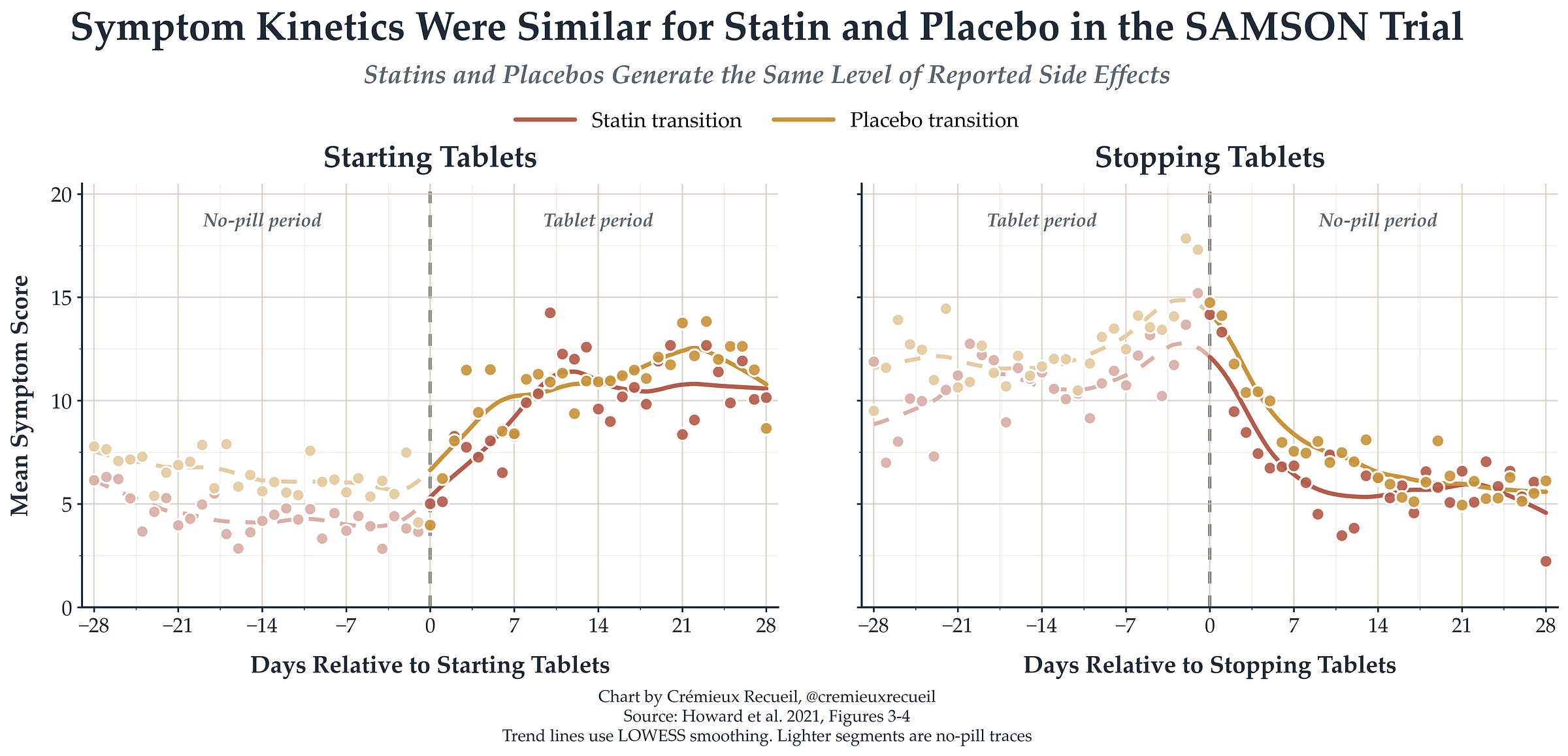 SAMSON: This study took people who had previously stopped statins because of side effects and cycled them through atorvastatin, placebo, and no-tablet months to see how their side effect reports progressed. When people went on statins or placebo pills, they started reporting more symptoms, and they did so to similar degrees. When they came off either pill, they recovered to similar degrees, at the same rate. It was taking any pill that mattered to patients, not taking statins specifically. Placebo was enough.
