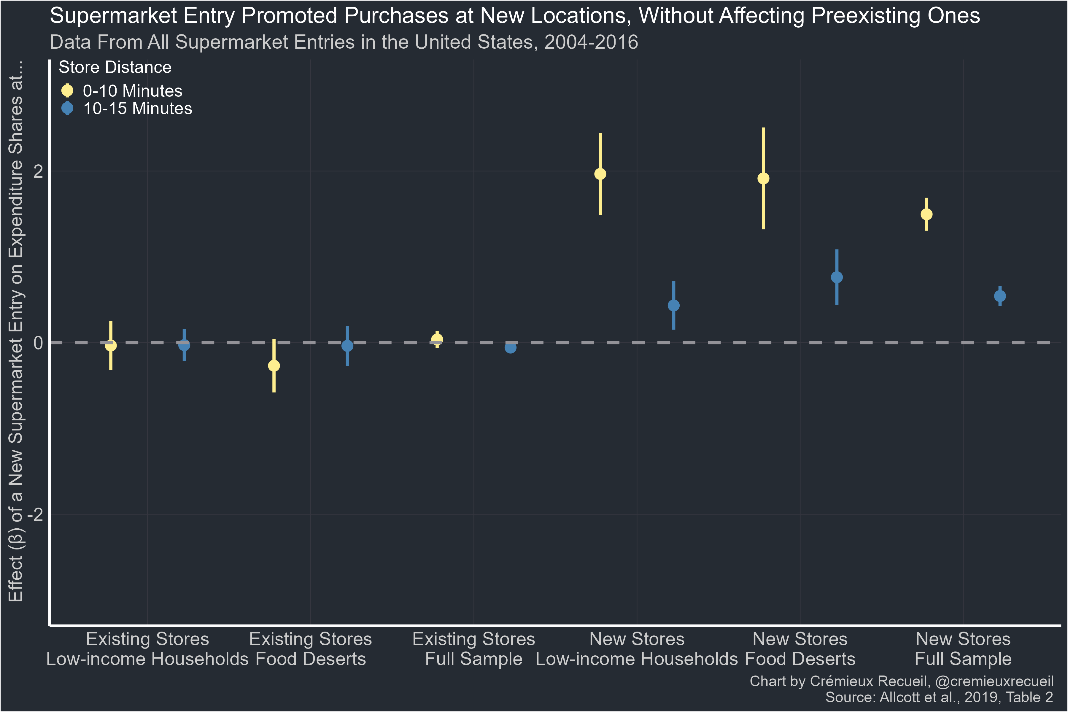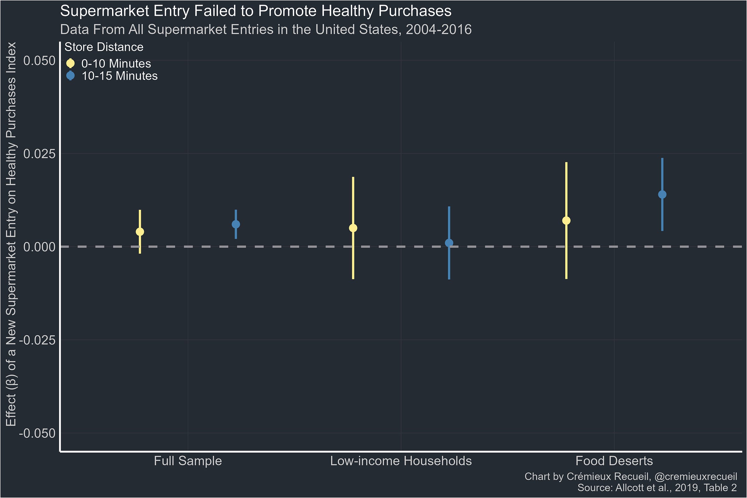 The effect of new supermarket openings is to grab a share of local grocery sales, but the effect on healthy eating is glaringly absent, in total, among low-income households, and in food deserts specifically.