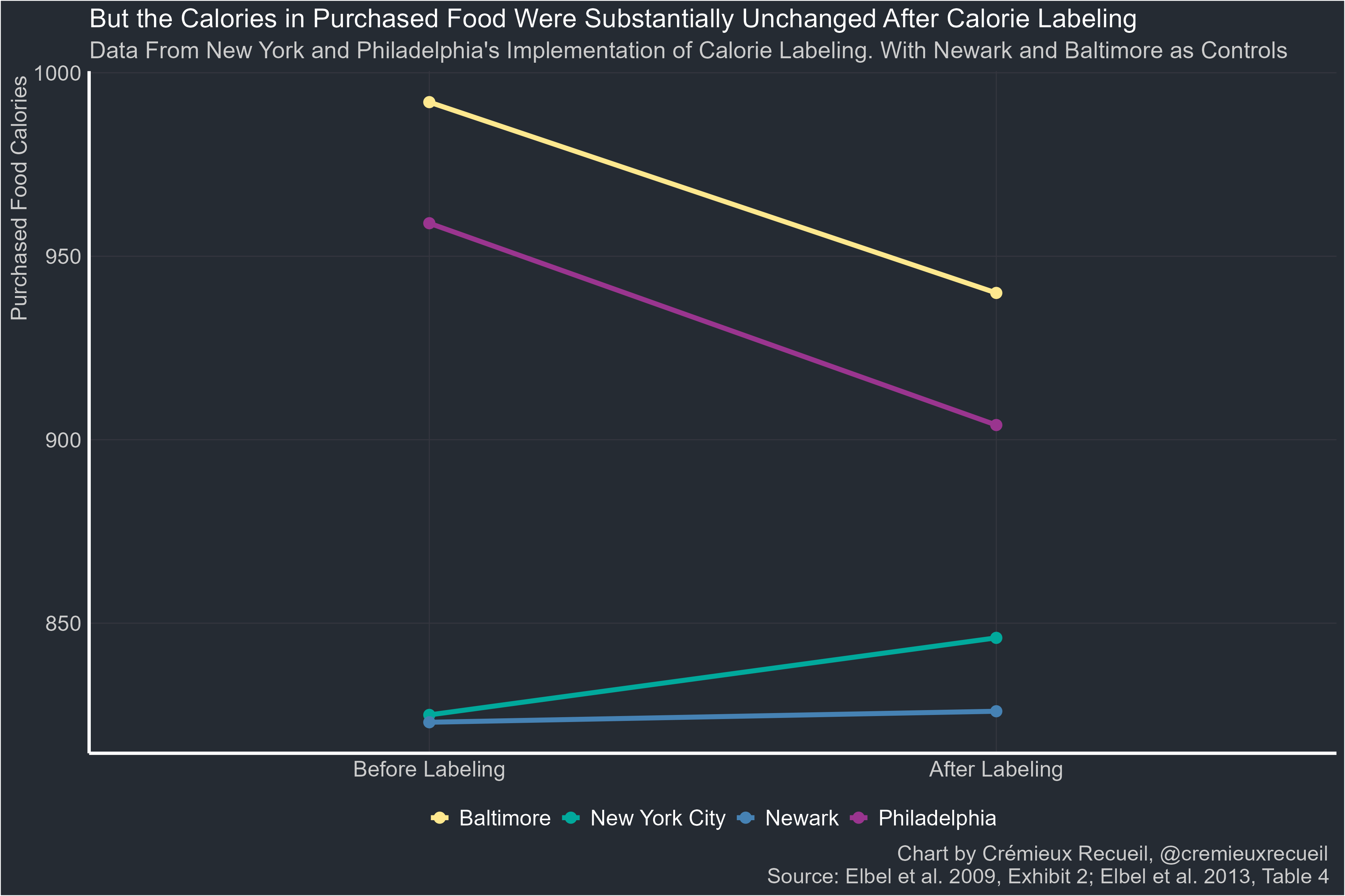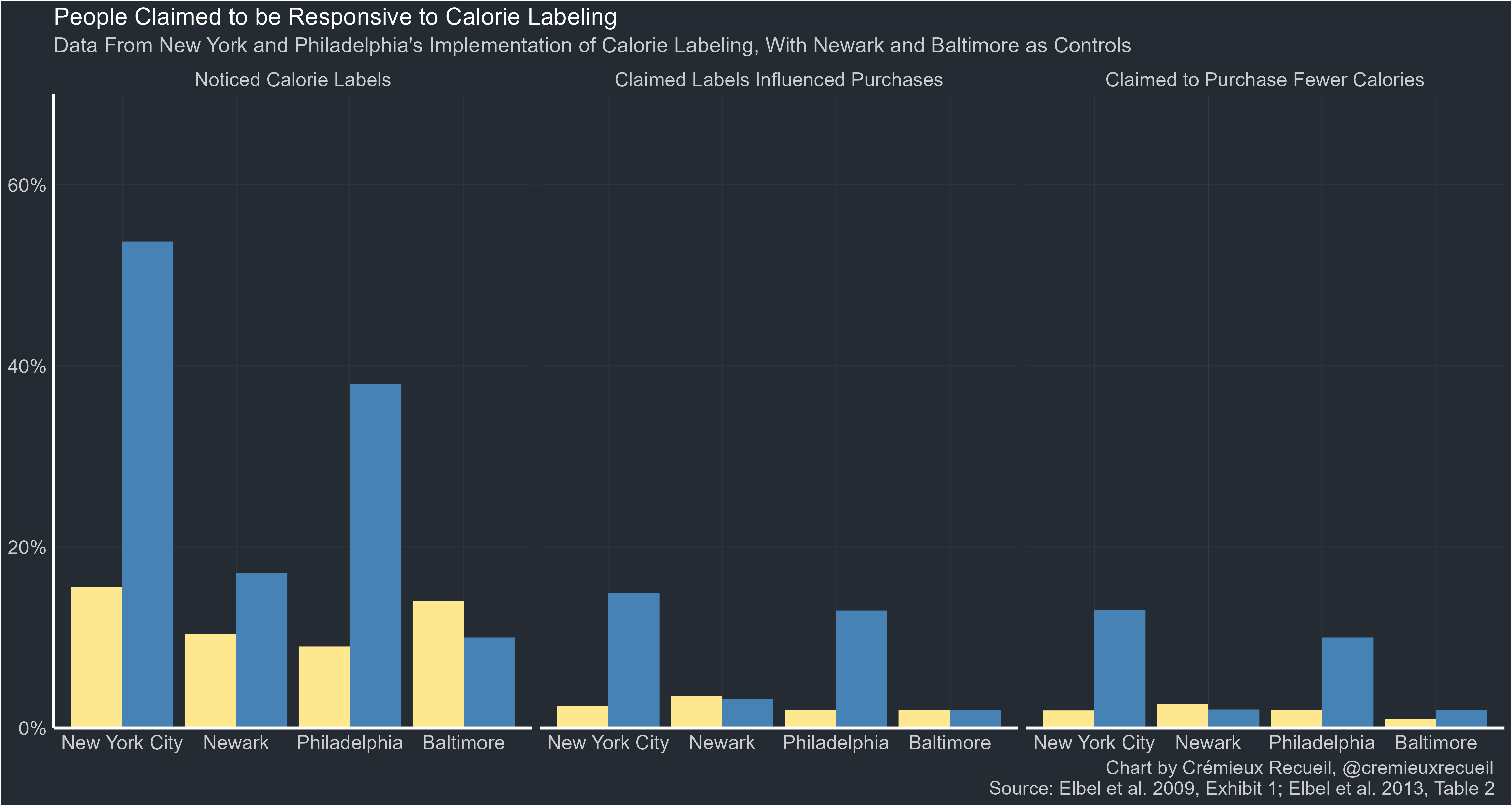 When calorie labeling mandates were implemented in New York and Philadelphia (Newark and Baltimore shown as comparisons), people noticed. People also claimed that calorie labels influenced their purchasing decisions, and they claimed that the direction of influence was generally towards buying fewer calories.