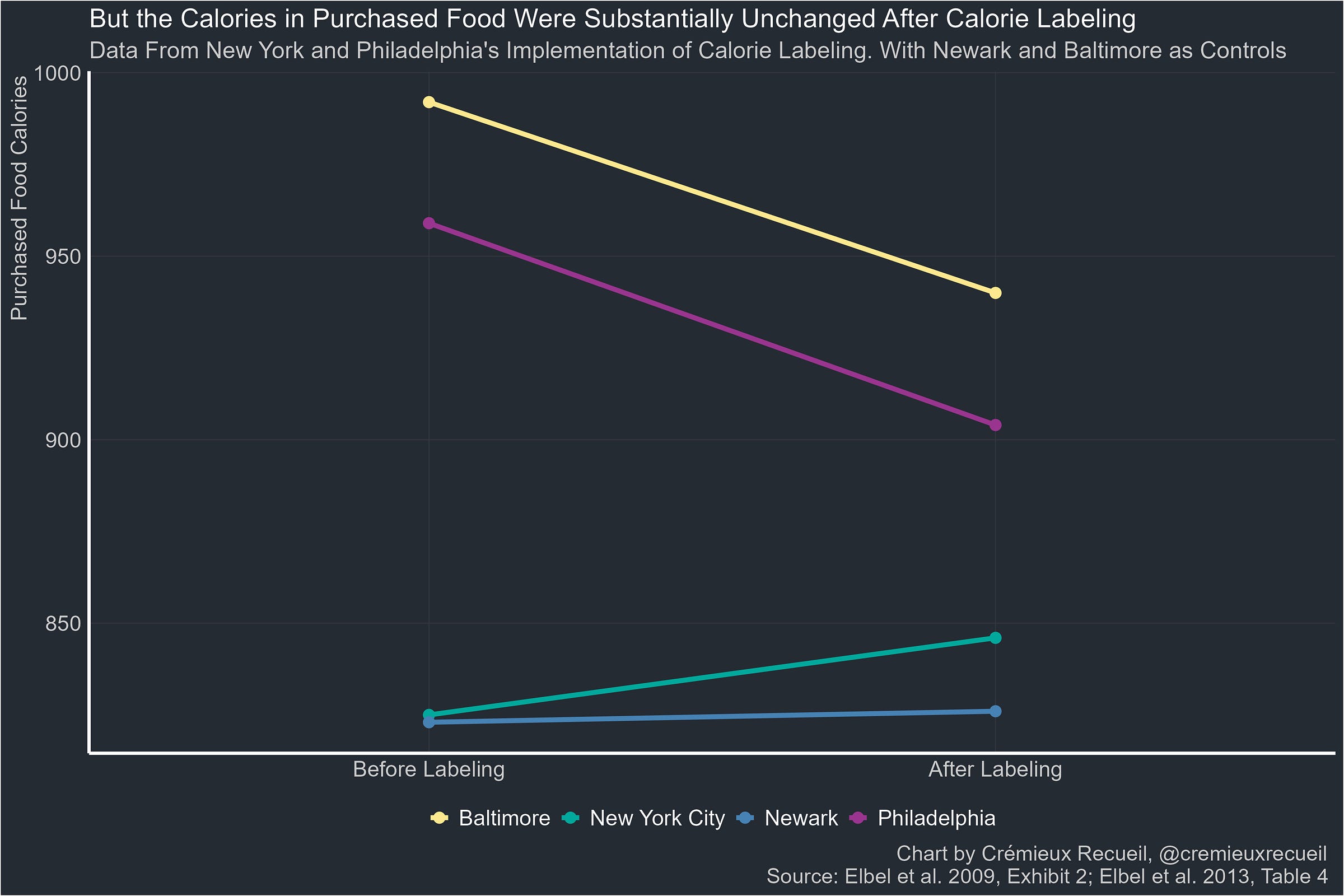 But what, in actuality, happened to their observed calorie consumption? Not a lot! In Baltimore and Philadelphia, calorie consumption fell by similar margins, but Baltimore didn’t have a mandate. Similarly, New York City saw an increase in calories purchased over non-mandating Newark.