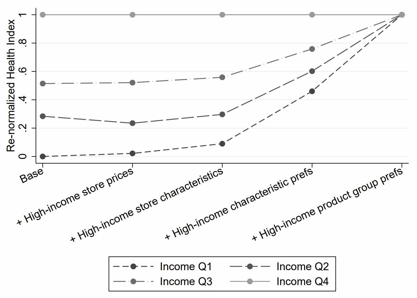 At baseline, there’s a large gap in food purchasing healthfulness, and scaling the lower-income groups’ prices to the level observed in the highest-income group does little to change that. Setting the available product nutrient quality to be equal also doesn’t do much either, but giving the different income groups identical nutrient preferences does start to make a noticeable difference. Finally, the gap between households with top and bottom incomes is virtually eliminated (reduced by 88-93%) after matching them on their product preferences.