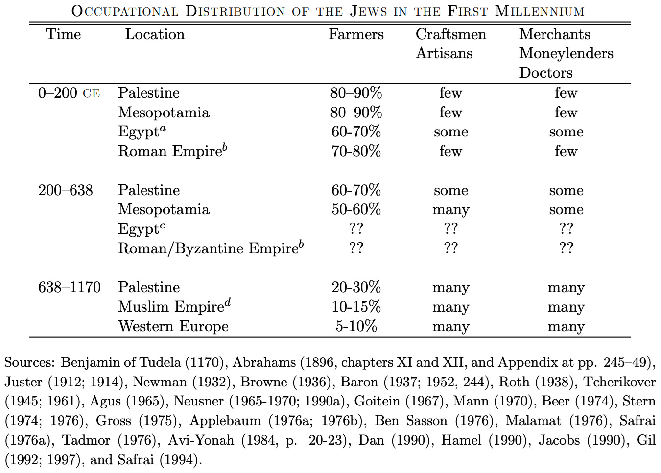 The reason for this has to do with Muslim efforts to urbanize. With the deliberate establishment of urban centers, suddenly there was a place Jews could go and become craftsmen, traders, and members of other skilled occupations. Jews also had faith-based advantages in these occupations beyond literacy, in the form of contract-enforcing institutions specific to Jews and relationships among Jews. With motive and opportunity, Jews went from being largely rural and farmers—like most everyone else—to being both literate and skilled: