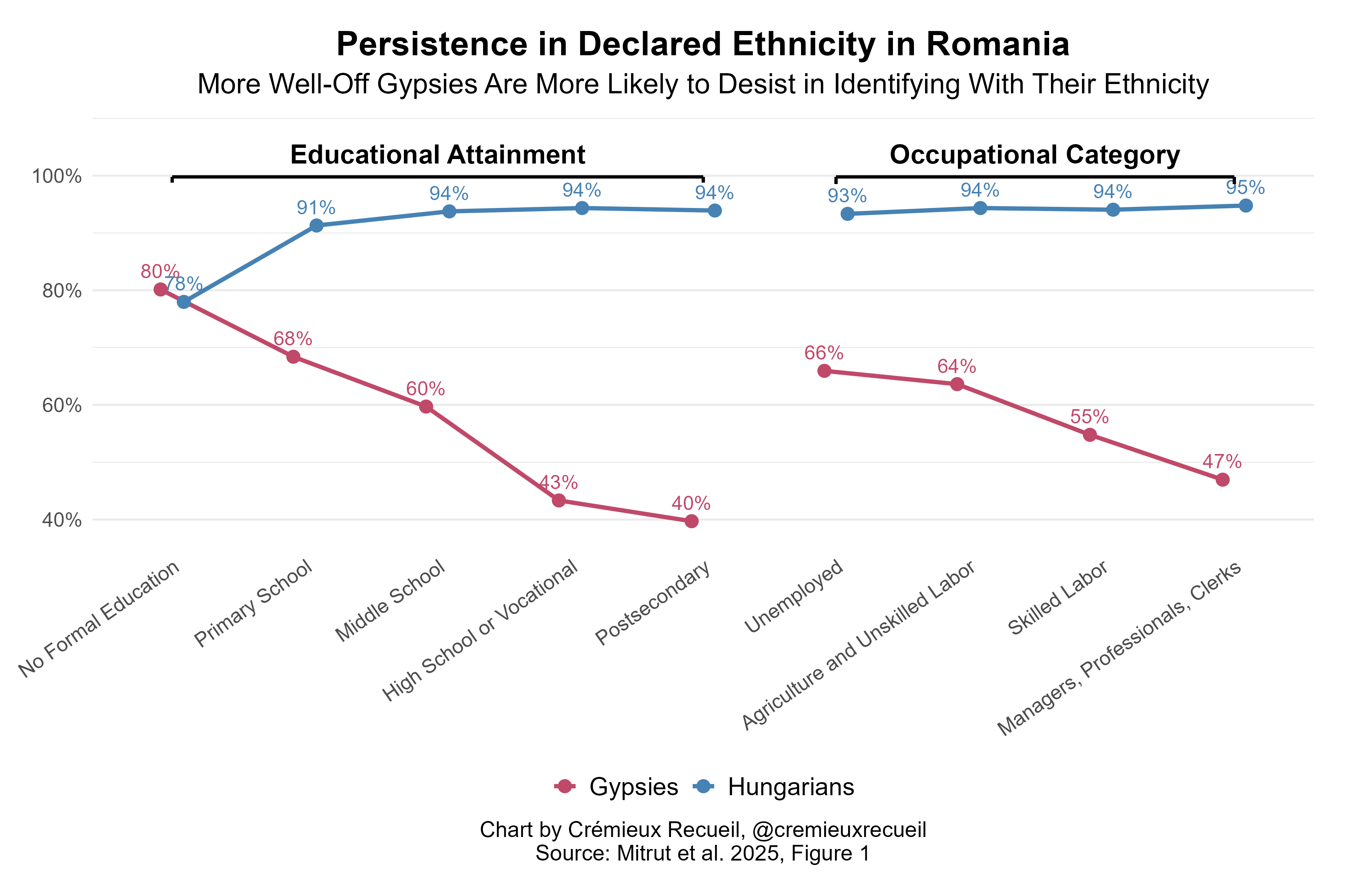 The authors of this paper had access to Romanian administrative data covering millions of Romanians. This data includes self-reports on individuals’ ethnicities, self-reported over several years. With this data in hand, the authors could check whether people persisted or desisted in identifying as members of a given ethnic group, such as gypsies or Romania’s more prominent minority ethnic group, Hungarians.