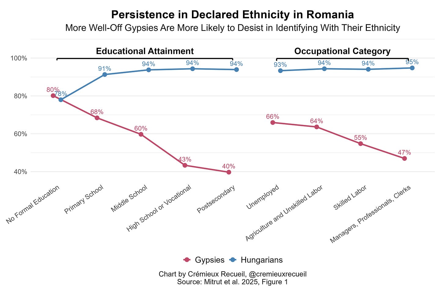 Accounting for gypsy passing “explains roughly 13% of the Roma-non-Roma education gap.” It also plausibly contributes to stereotypes of gypsies, because the ones who keep identifying as gypsies are less elite than the ones who stop. In other words, what Romanians know and dislike about gypsies, the low-class stereotype… it may be true, but it’s less true than they tend to know, because high-class gypsies stop identifying as gypsies and Romanians don’t know it: