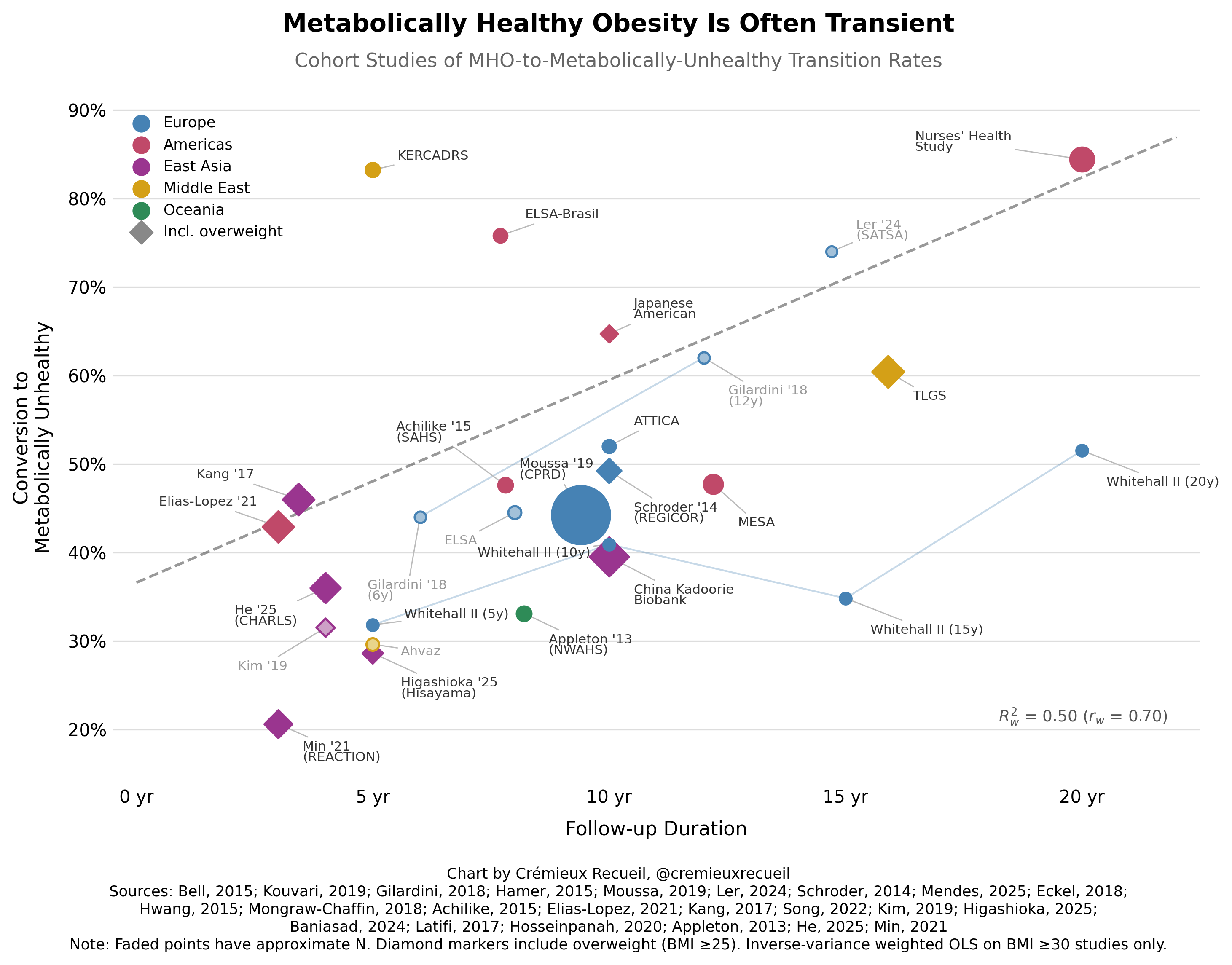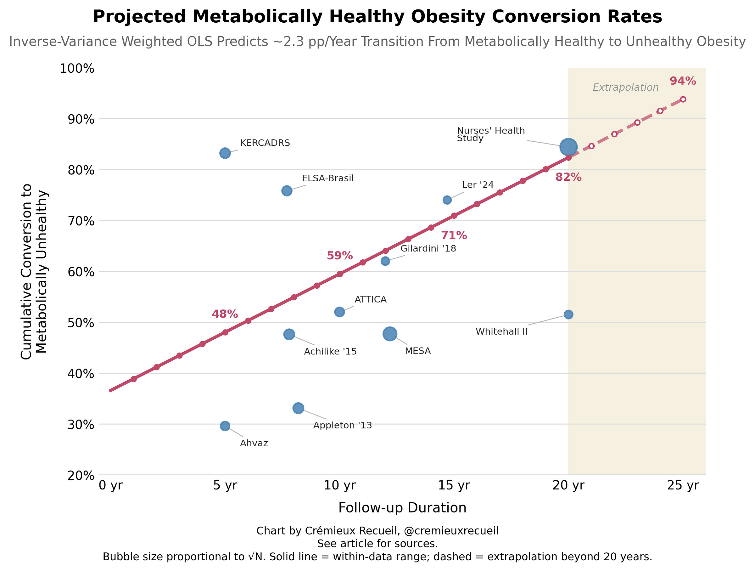 Though I’m not confident in the appropriateness of this analysis, it is possible to take the results from these different studies, with all their differences in definition noted, and to make a projection about how stable MHO can be. If we do that, it looks like 8-9/10 cases of MHO become MUO by 20 years in. That’s a theoretically dubious estimate, but I imagine something like it is not that far off the mark. Majority conversion in that time is highly believable.