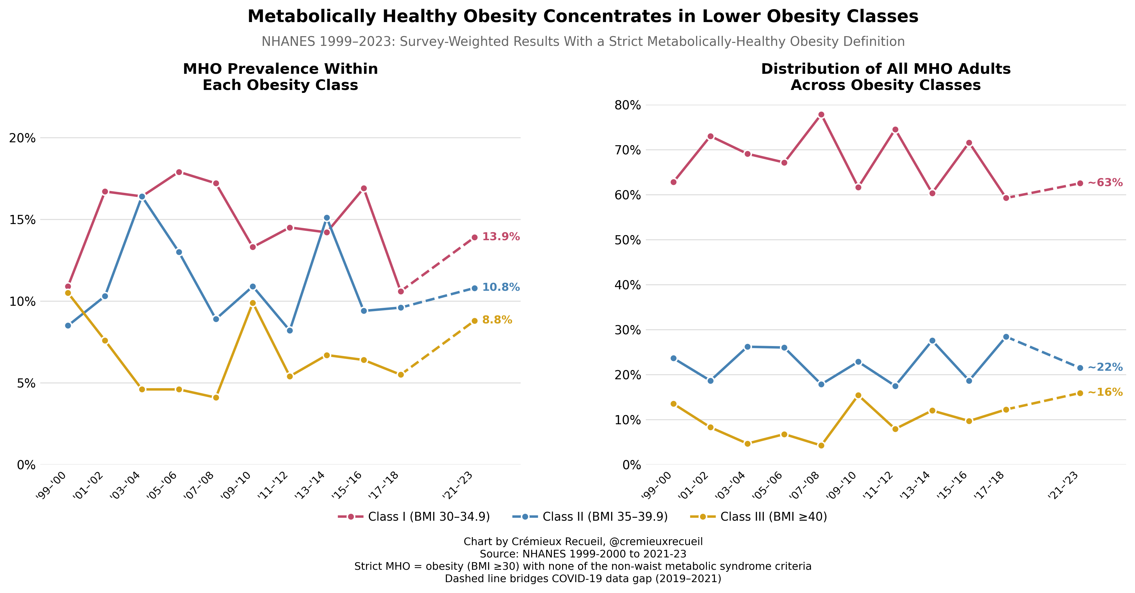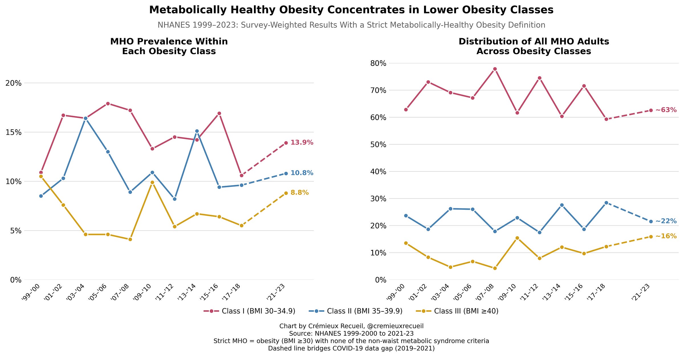 8.8 to 13.9% of each obesity category qualified as MHO in the latest sampling year based on a fairly strict definition I found had been used in this dataset by Wang et al. Because more of the obese are Class I (i.e., BMIs of 30-34.9) than are in the higher BMI classes, the majority (about two-thirds) of those who are MHO are borderline obese, and with more extreme obesity, MHO is rarer relative to MUO. This is consistent with the findings of the SMK review: