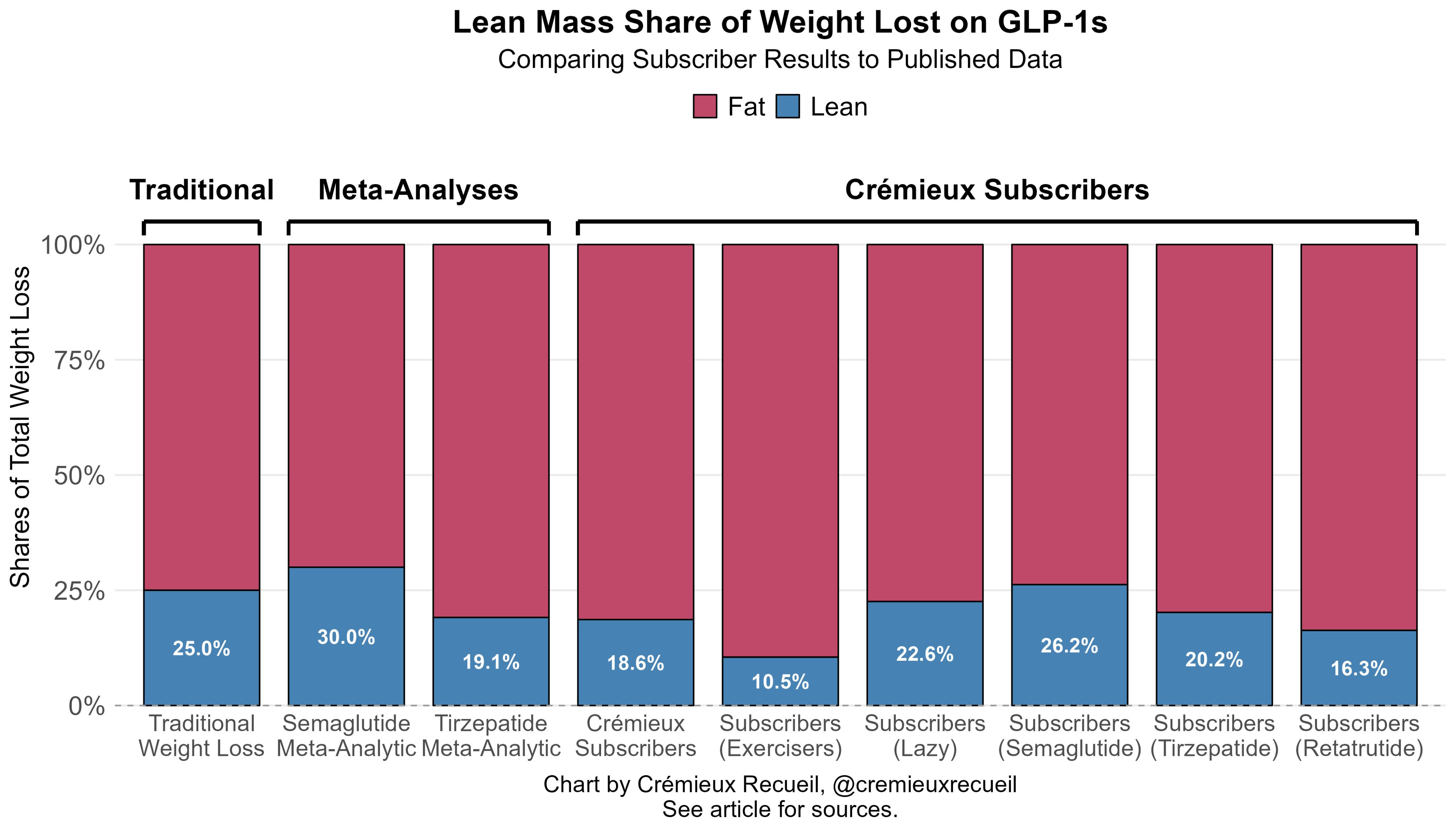One popular argument against GLP-1RAs is that they lead to excessively high muscle mass loss compared to standard, non-pharmacological weight loss. Some people have even taken this so far as to claim that GLP-1RAs lead to more muscle than fat loss. Both points are difficult to credibly support, but there is at least something intuitively sensible about the first claim even if a pharmacological mechanism is absent. A pretty apparent fact is that the people who use GLP-1RAs tend to be lazier: they tend to exercise less and eat worse than people losing weight the traditional, non-drug assisted way. That could have predictable consequences for the ratio of muscle to fat loss, or so the logic goes.
