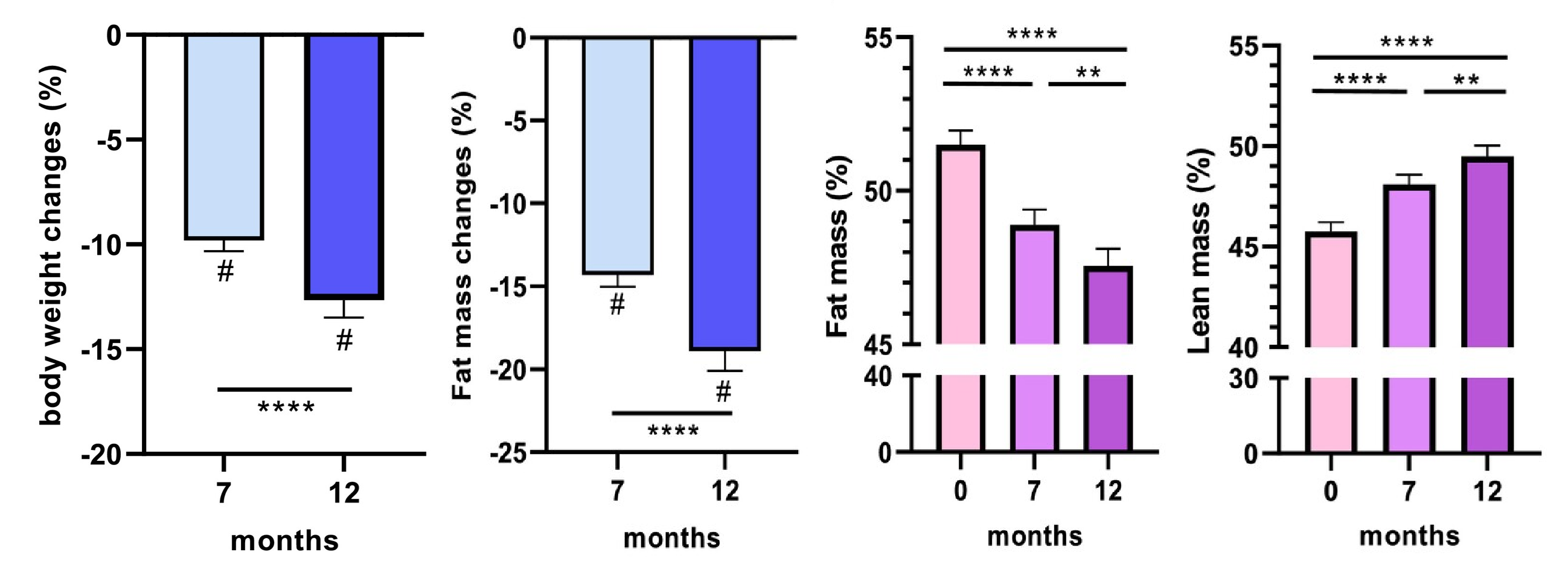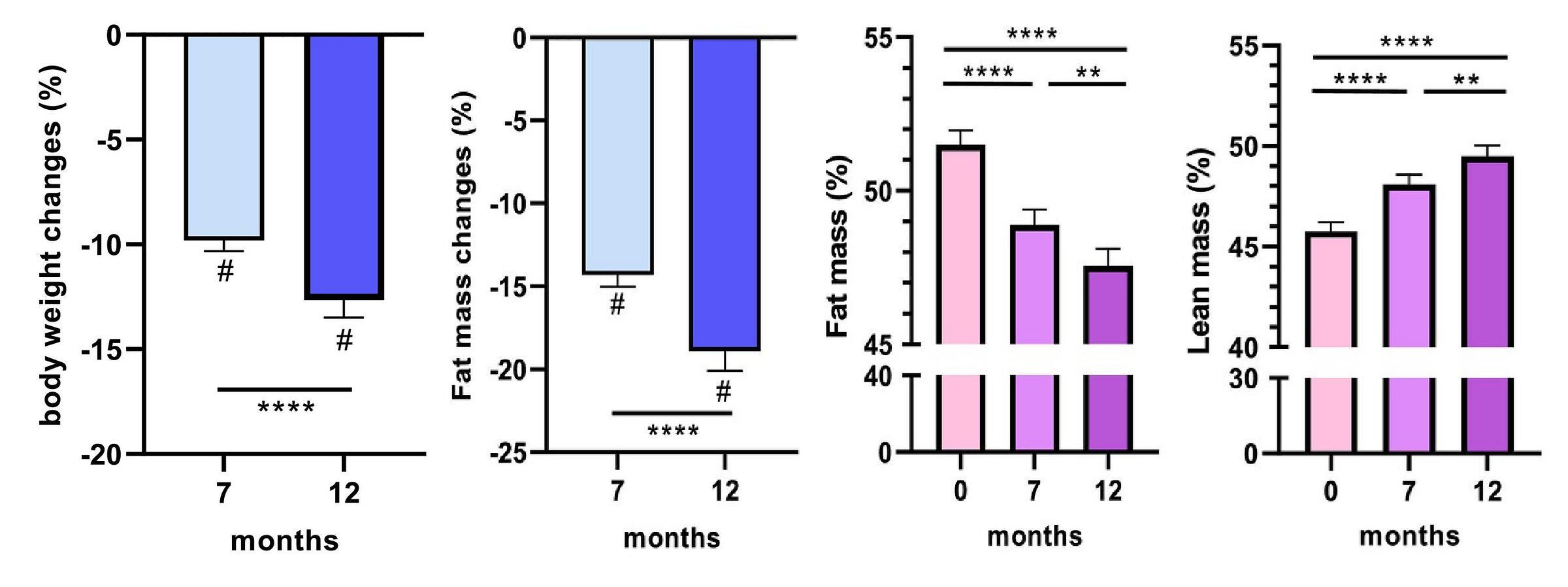 Alissou et al. presented the results of the one-year SEMALEAN study, which aimed to assess the effects of semaglutide on the body composition and physical functioning of severely obese patients. Over twelve months, these patients lost significant amounts of weight, of which 22% was lean and 78% was fat. Additionally, people became slightly more hydrated, as water’s share of lean mass increased a bit. You can see the total, fat, and lean mass changes here: