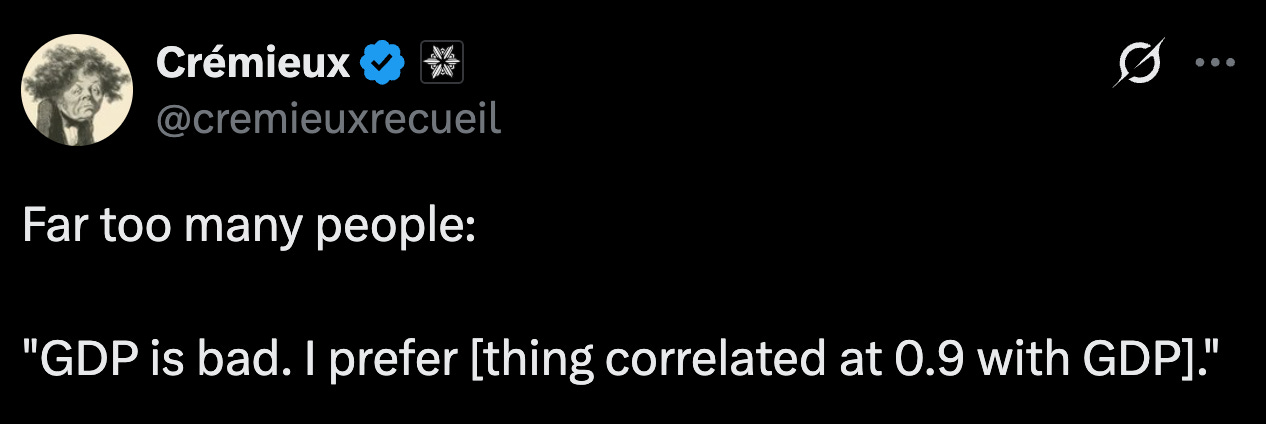 There are strong mathematical drivers behind GDP’s correlations with other composites, and with many other variables that effectively index GDP, even when those things are not directly causally rolled up with GDP per se.4 That much is certain, so now I want to talk about some other implications of Wilks’ curious finding.