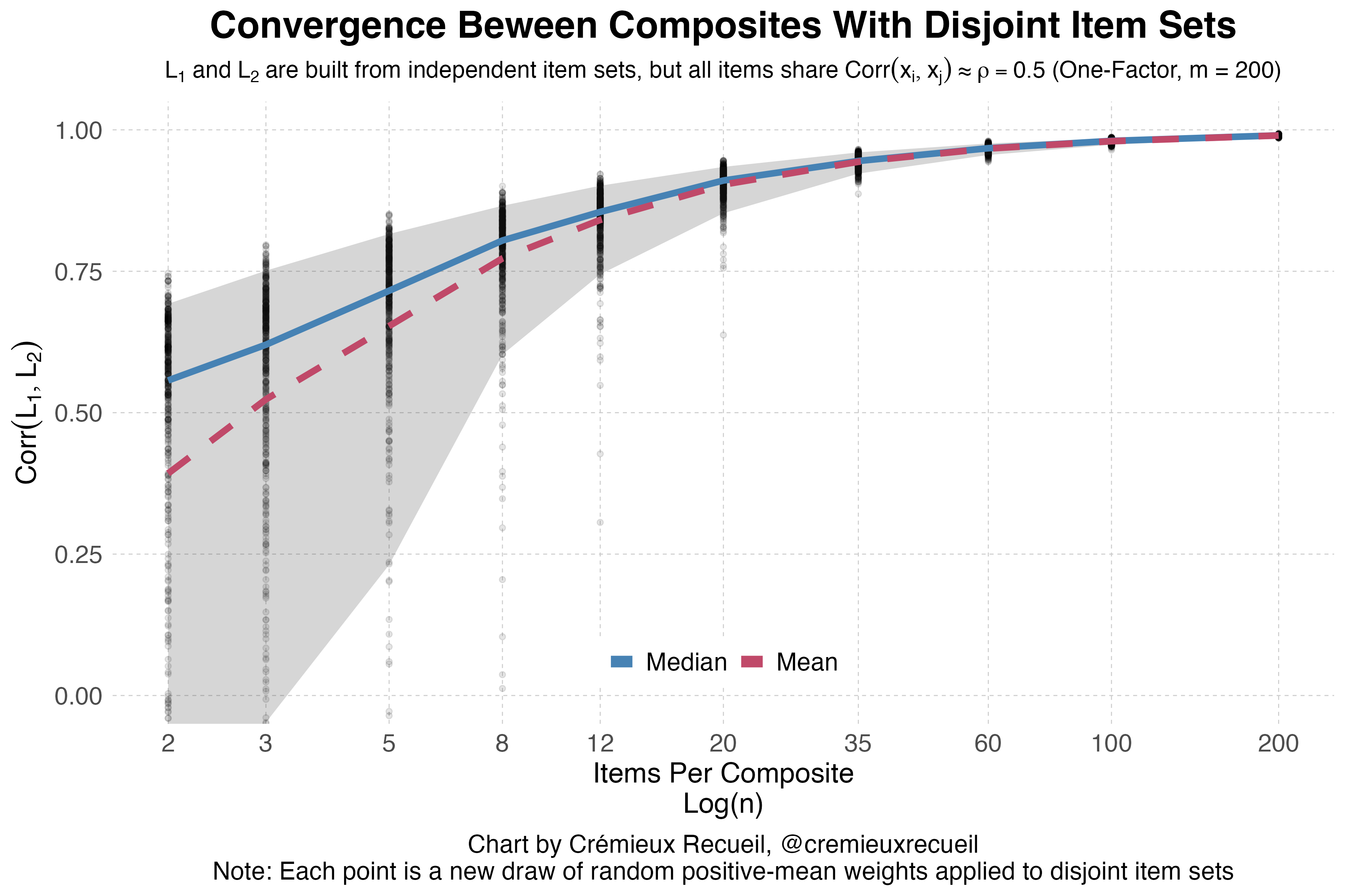 Visually, you can see these correlations rising rapidly even with disjoint sets of items whose intercorrelations that are, on average, quite modest, at around 0.5. If you adjust this upwards, the convergence rises faster, and if you adjust it downwards, it rises more slowly, but in both cases, it rises.