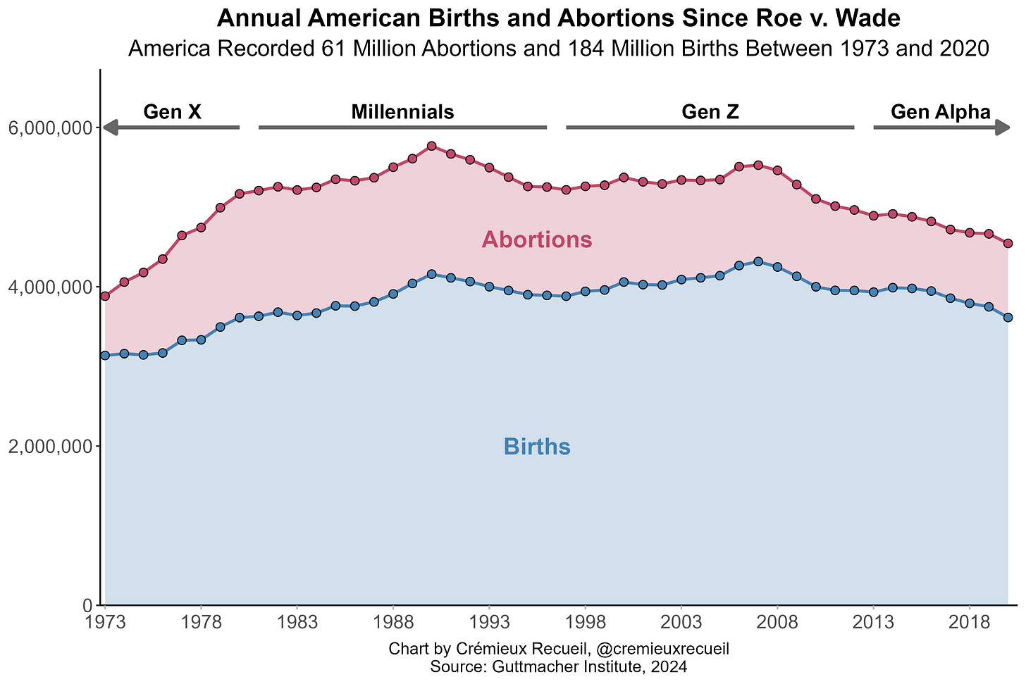 Between the Roe v. Wade decision in 1973 and the Dobbs v. Jackson Women’s Health Organization decision in 2022, women had access to abortion because of the Supreme Court’s decision to establish a woman’s constitutional right to it based on the right to privacy. During that time, Americans underwent tens of millions of abortions. Given that America only experienced tens of millions of births in that same timeframe, the answer to my question is likely a nontrivial portion: a potentially sizable part of the generations that have been born since 1973 may have been aborted.