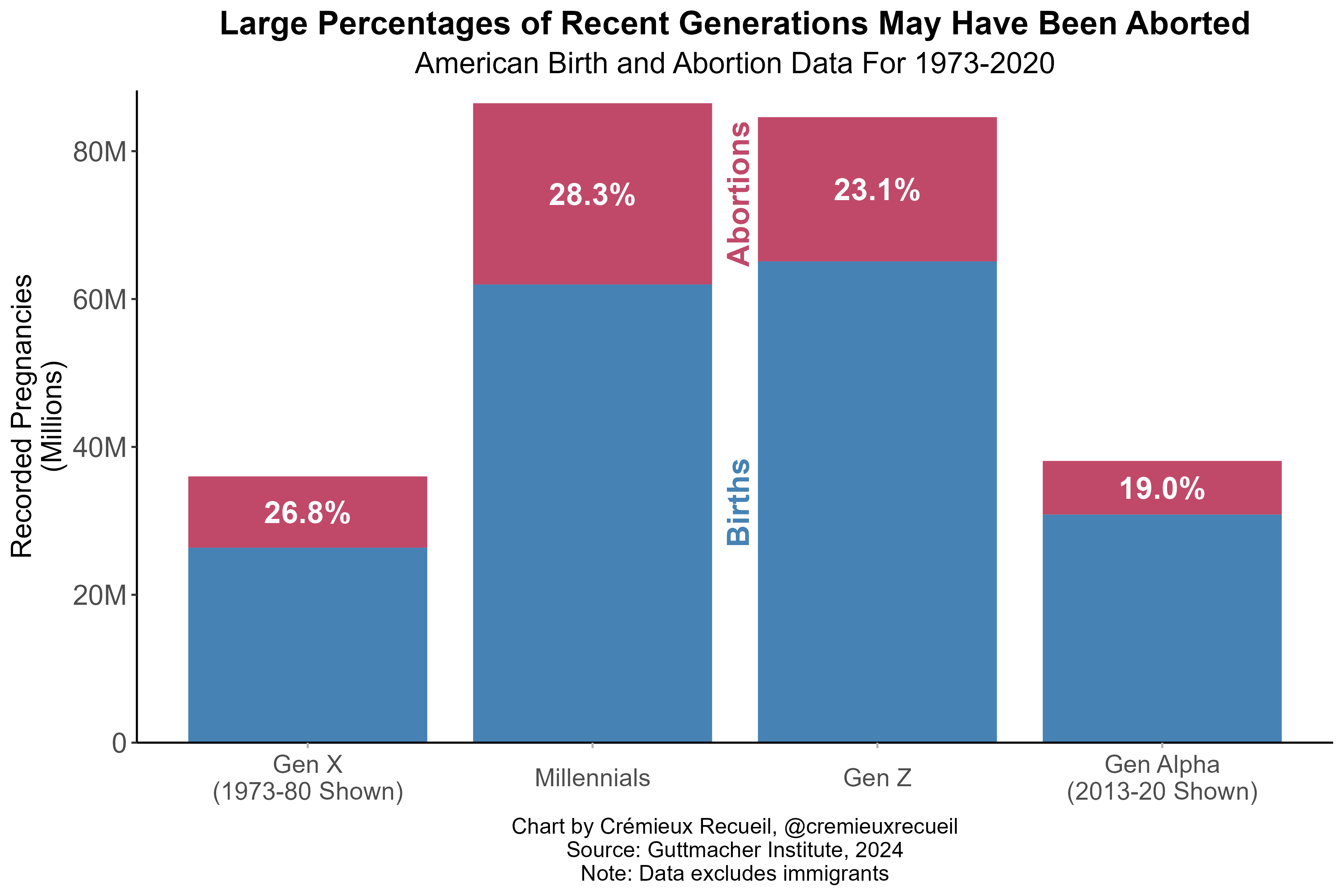 If we naïvely tally up America’s abortions, we can see that potentially over a quarter of Gen X and Millennials were aborted, nearly as many Gen Z met that fate, and almost a fifth of Gen Alpha were treated the same way.