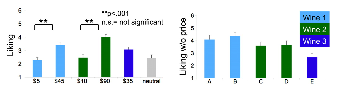 Including price information about wines in a tasting, for example, leads to disparities in evaluations (left). Masking price information (right) returns people back to their senses so they maintain that they “like” the same wine consistently when it’s served to them. This effect is strong enough to modify the rank-order of wine judgments to such a degree that they place wines they like less—in the absence of price information—ahead of wines they would actually like more!