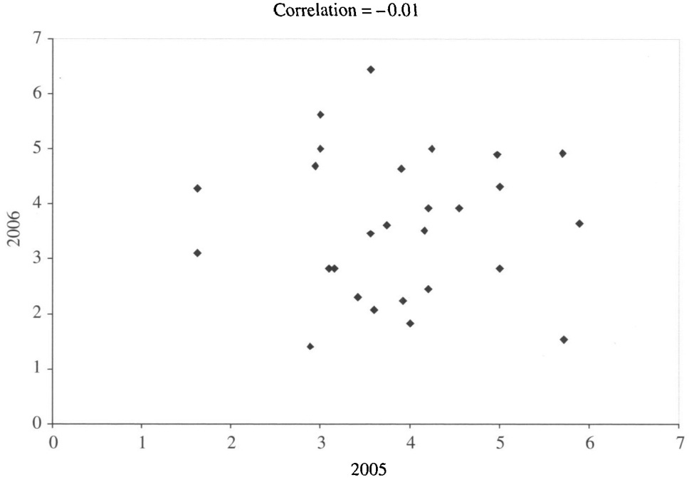 This was repeated across years, too. Judge variance in one year did not predict their variance the next year at all.