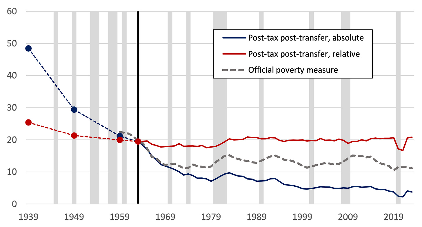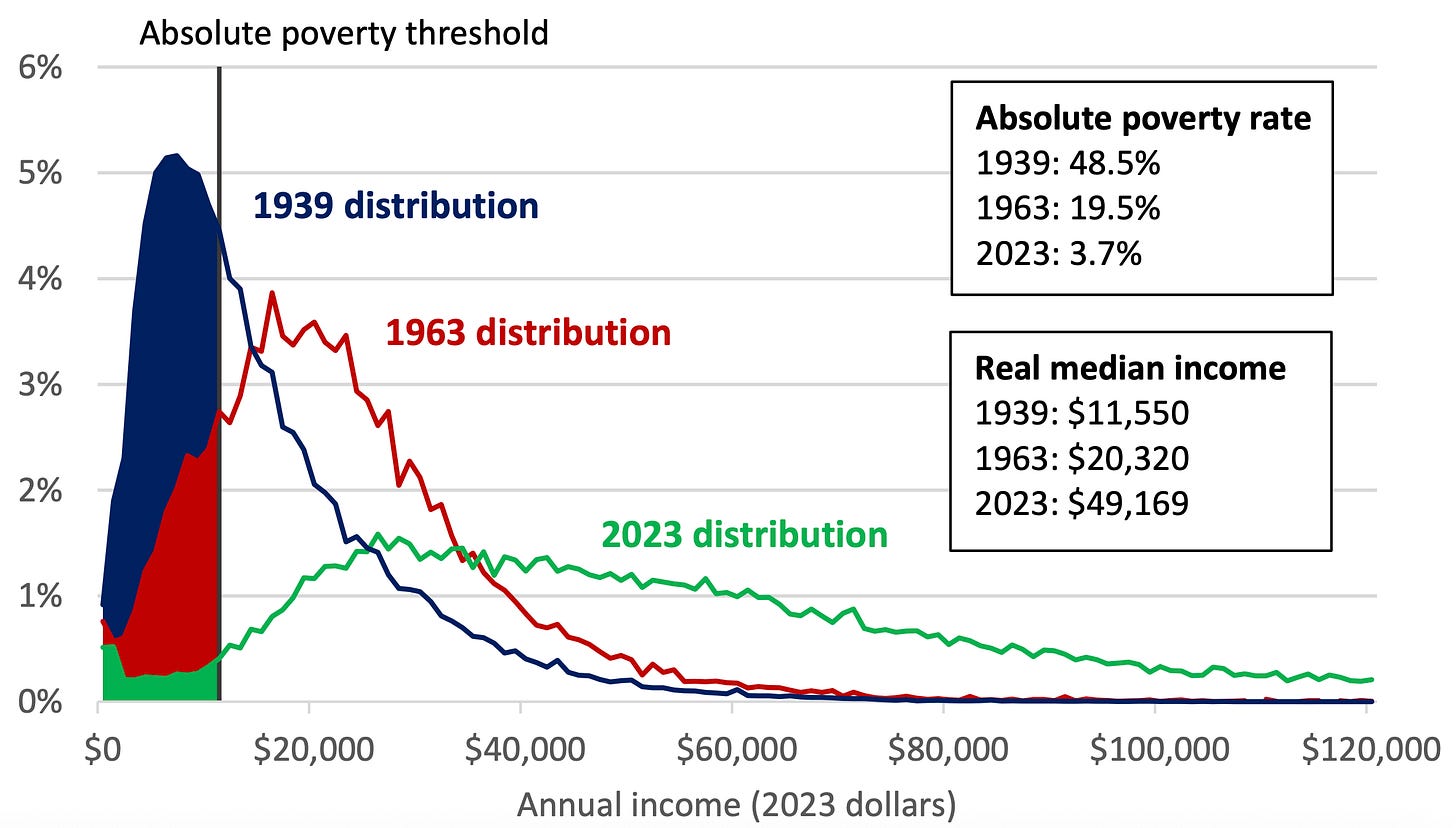 Moreover, a large share of the decline of poverty has been due to growth rather than transfers. By market income, 93% of Black kids in 1939 were in poverty and 21% in 2023 were, with half of that reduction coming after the War on Poverty begins.1