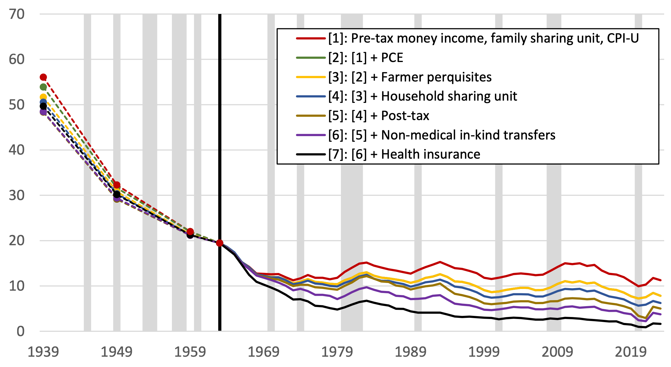 Burkhauser and Corinth have a new preprint on poverty measured in absolute terms. In this paper, they’ve extended the timeline back to 1939 and provided poverty rates split by race and age. Let’s look at the full timeline first:
