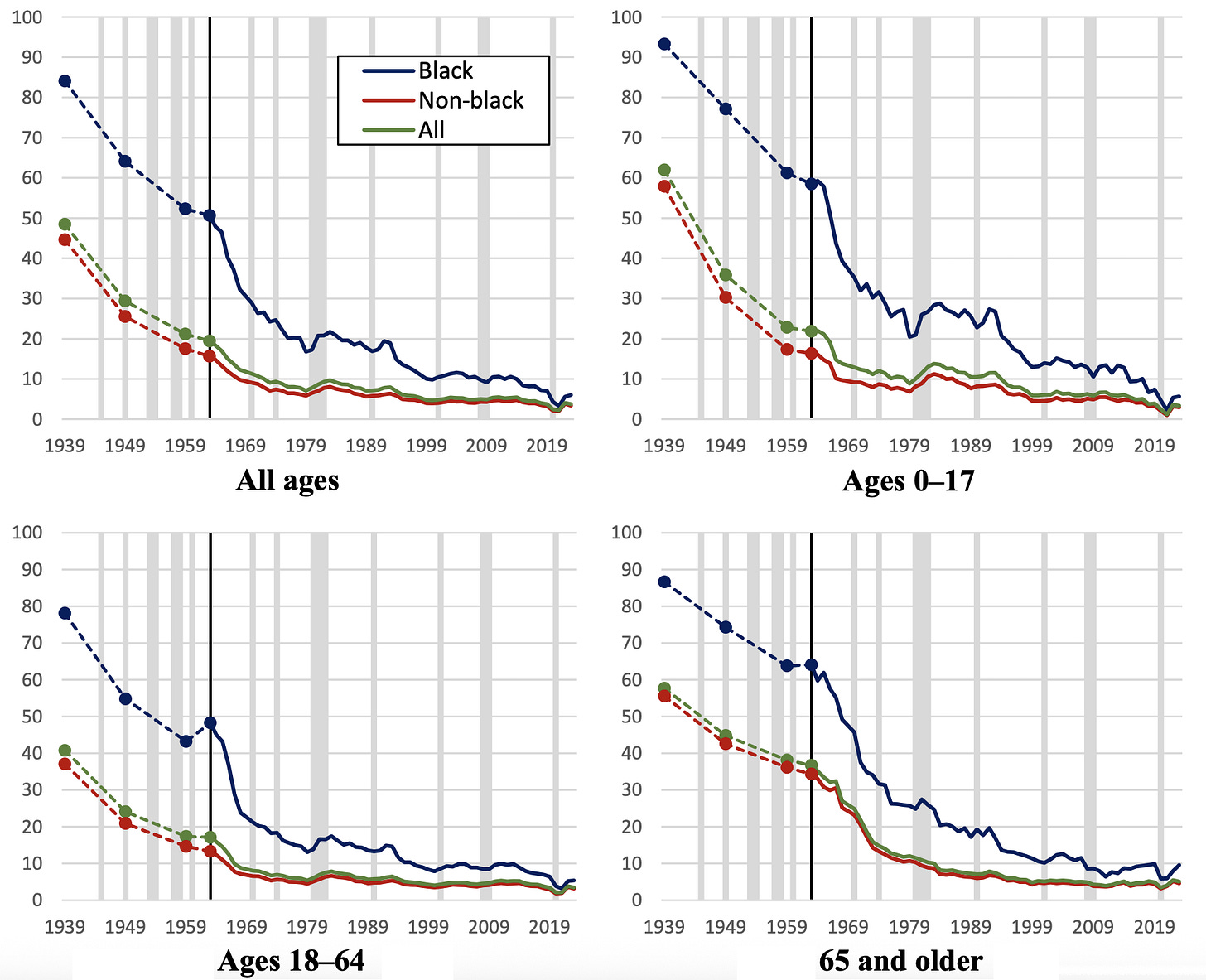 The level of poverty reduction shown in the above set of graphs is amazing. In 1939, nine-tenths of Black children (~93%) were in poverty, whereas in 2023, the rate is just 6%. There’s a smaller percentage who are in poverty in today than who weren’t in poverty in 1939!