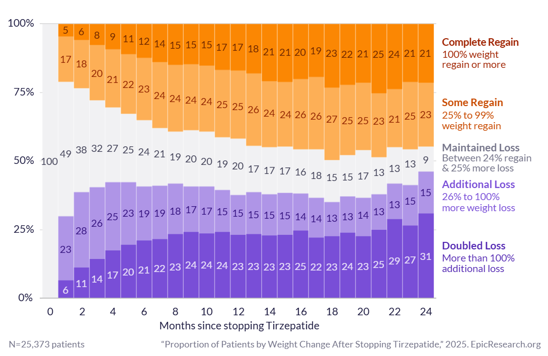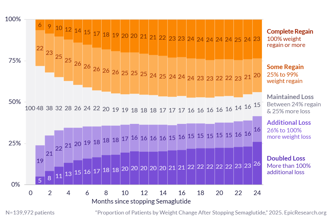 Epic has updated their analyses of weight regain. Their analysis for semaglutide now has a 6.9-times larger sample and goes to two years instead of stopping at one year. That result is even more reassuring about the lack of an issue with weight regain after stopping semaglutide. Why? Because regain practically stopped at one year and the whole sample stabilized! Compare this to the chart above; it’s a heartening result: