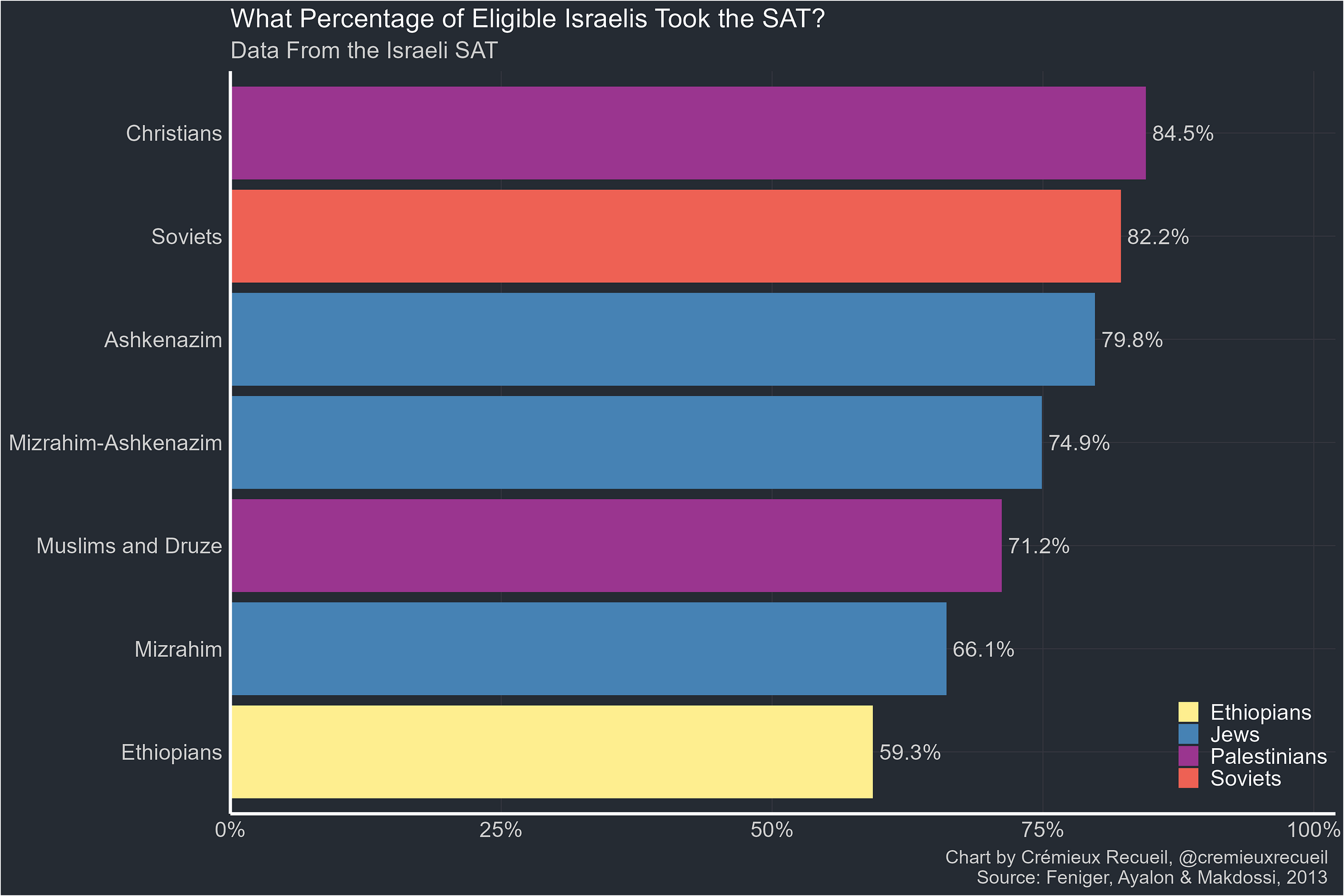 Right after that article went live, a reader found some interesting data from around 2012 or 2013 from the Israeli version of the SAT, the PET, or Psychometric Entrance Test. Scores on this examination were provided for Ashkenazim (619), mixed Ashkenazim-Mizrahim (597), Mizrahim (559), Ethiopians (401), the Soviet émigré (559), Muslims and Druze (447), and Christians (480).