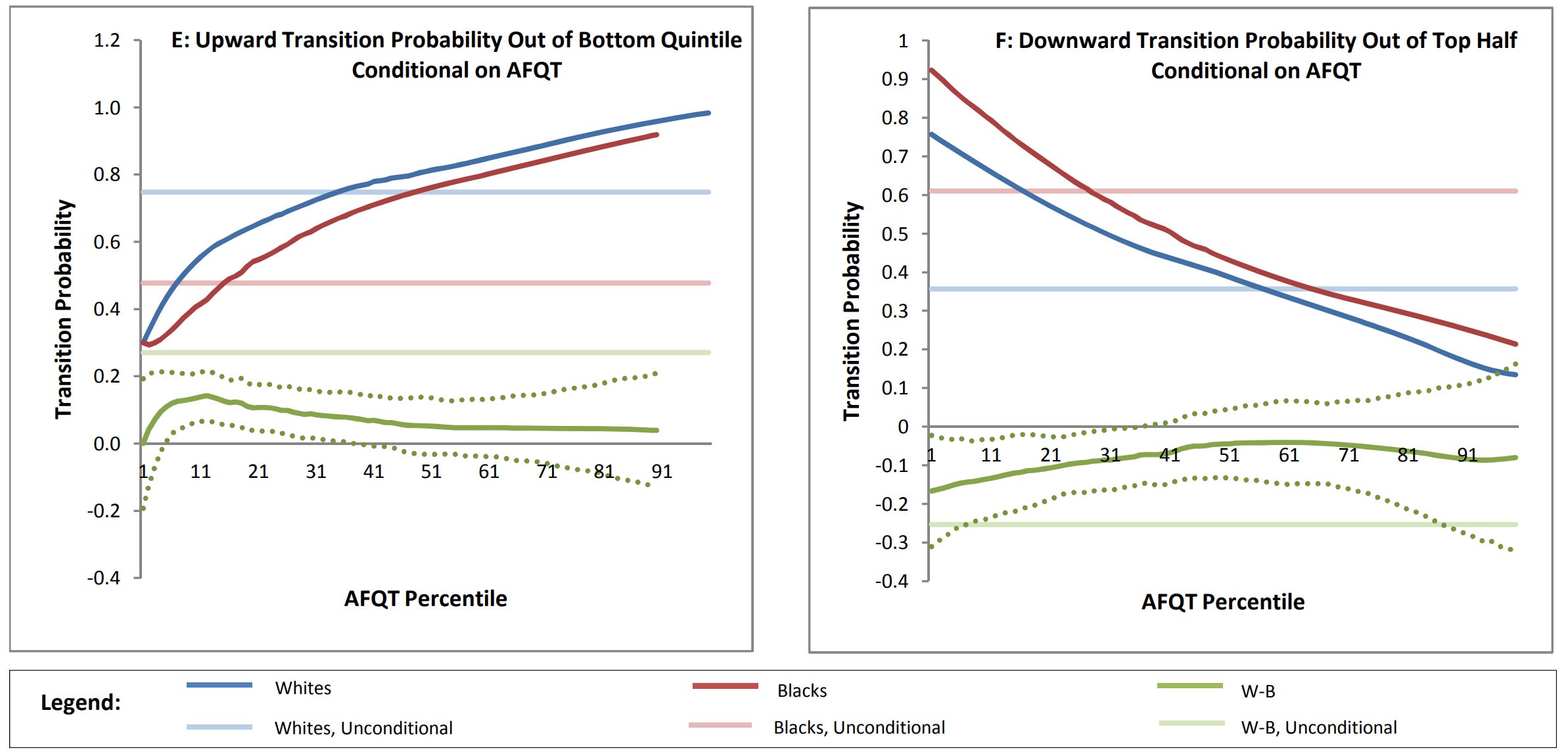 Resumes with White names received 50% more callbacks for interviews. Other research has taken this even further. Before looking at that research, consider the fact that the Black-White gap in socioeconomic mobility is usually eliminated or reduced to a pittance when controlling for test scores, or better yet, for general intelligence. Here’s one example using the NLSY’s AFQT: