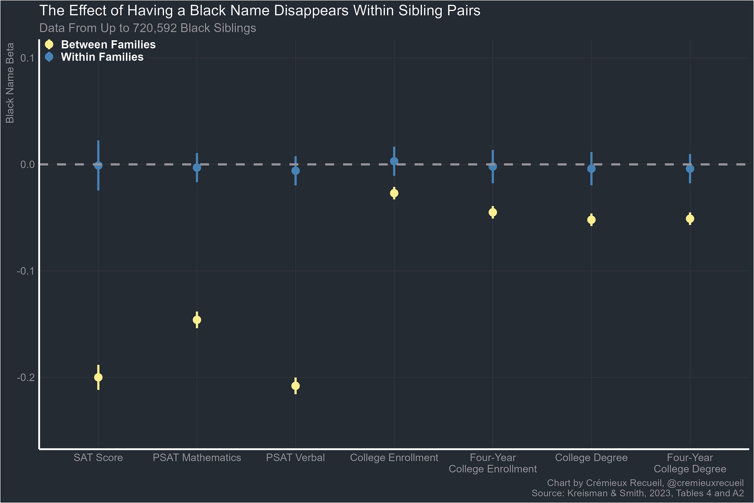 But within families, there is no negative effect of having a Black name. Instead, the result is a precisely-estimated null effect. Individuals with Black names do not have lower SAT or PSAT scores than people with less Black names. In fact, they’re not even less likely to go to or complete college. Having a Black name is not an impairment even though the naïve estimate suggests it would be.