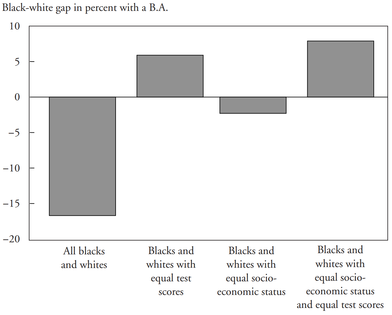 Blinding led to inconsistently significantly better ratings for women and minorities. In this scenario, we can be reasonably certain that the result is driven by bias because the sign of the effect is contrary to the direction we should expect unobservable applicant quality to run in. That’s one way audit studies can be saved: by invoking a strongly-supported theory. But since the object of most audit studies is assessing bias against groups that underperform, this is usually not possible. But that doesn’t matter to the meta-point, which is that that when blinding is over, group information can be rationally used to modify the values of other criteria on a person’s resume. The example of education, where there’s still a racial skill gap at all levels of it is quite apt.