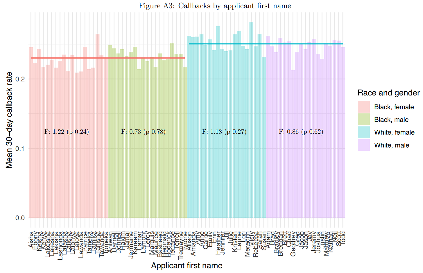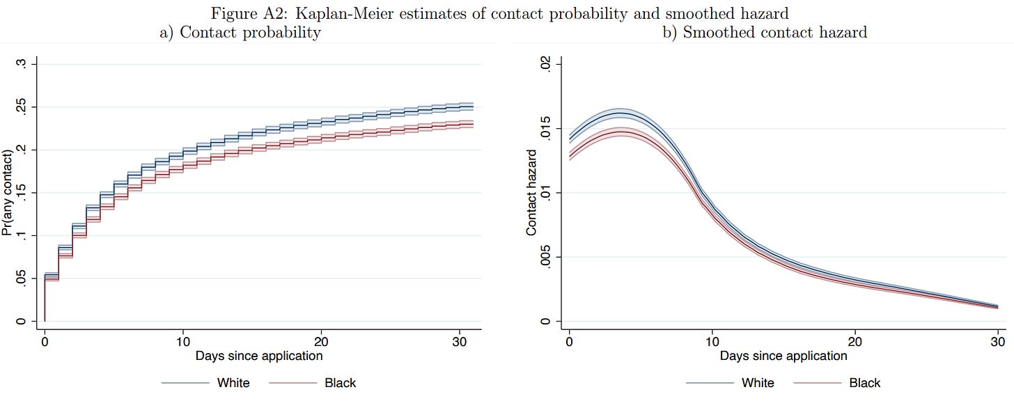 The other striking detail from that plot is the difference in callback rates. A staggering number of applications were sent out and the difference in callback rates ended up being much smaller than the one observed in work like Bertrand & Mullainathan’s It’s also smaller than the observed effects in meta-analyses.8 I guess this may as well go to show that one good study beats a publication bias-infected literature.9