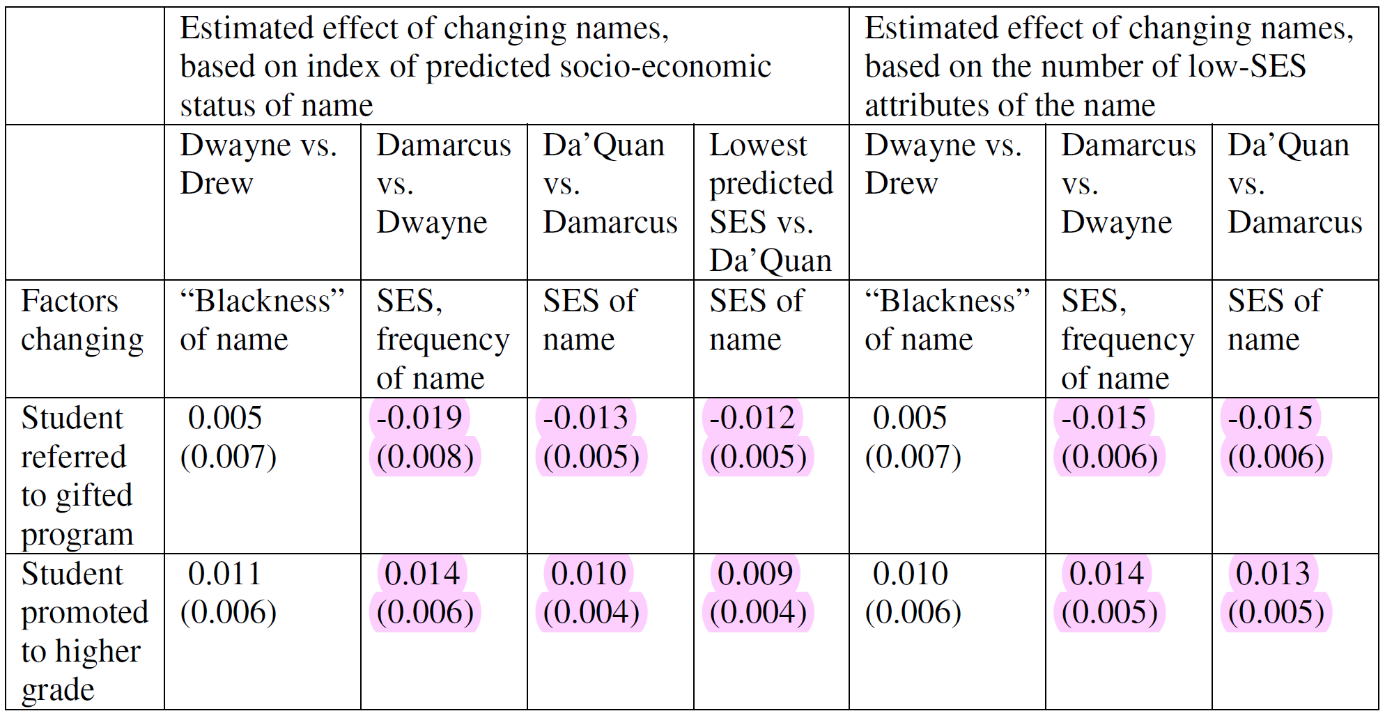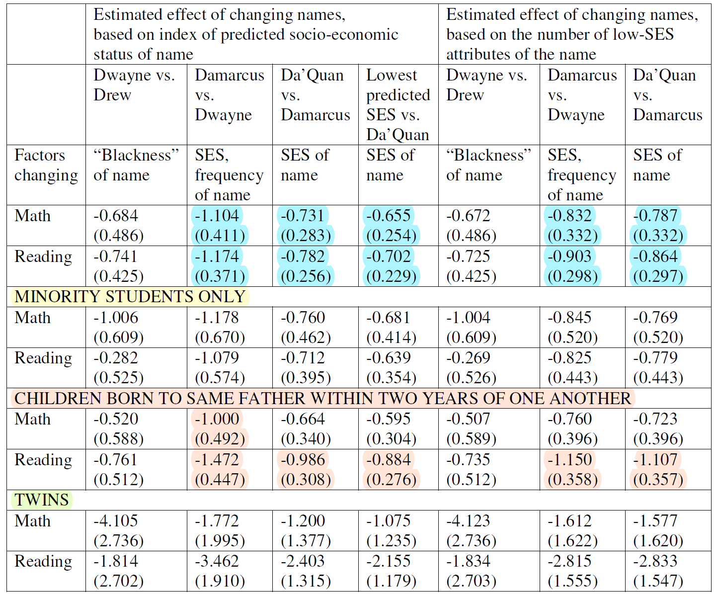 Onto the tests. To assess whether having a Black or low socioeconomic status name affected people’s outcomes, Figlio used sibling name differences to see what impact those had on people’s test scores. Let’s look at the first table. Highlighted results are significant.