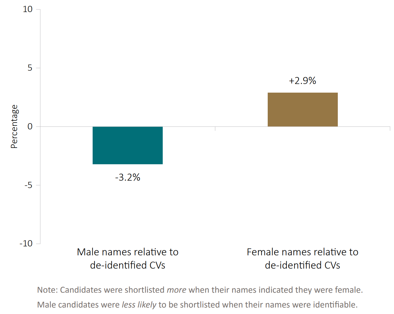 Another strategy that can be used to improve the identification of taste-based versus statistical discrimination is pretty expensive, and involves group self-comparisons. The way this works is simple. All you have to do is compare callback rates for resumes when their recipients are blind to group characteristics versus when they’re able to see them. When this is done, it can show that certain groups are favored or disfavored on the bases of their identities. For example, here’s a 2017 blind audit of the Australian Public Service: