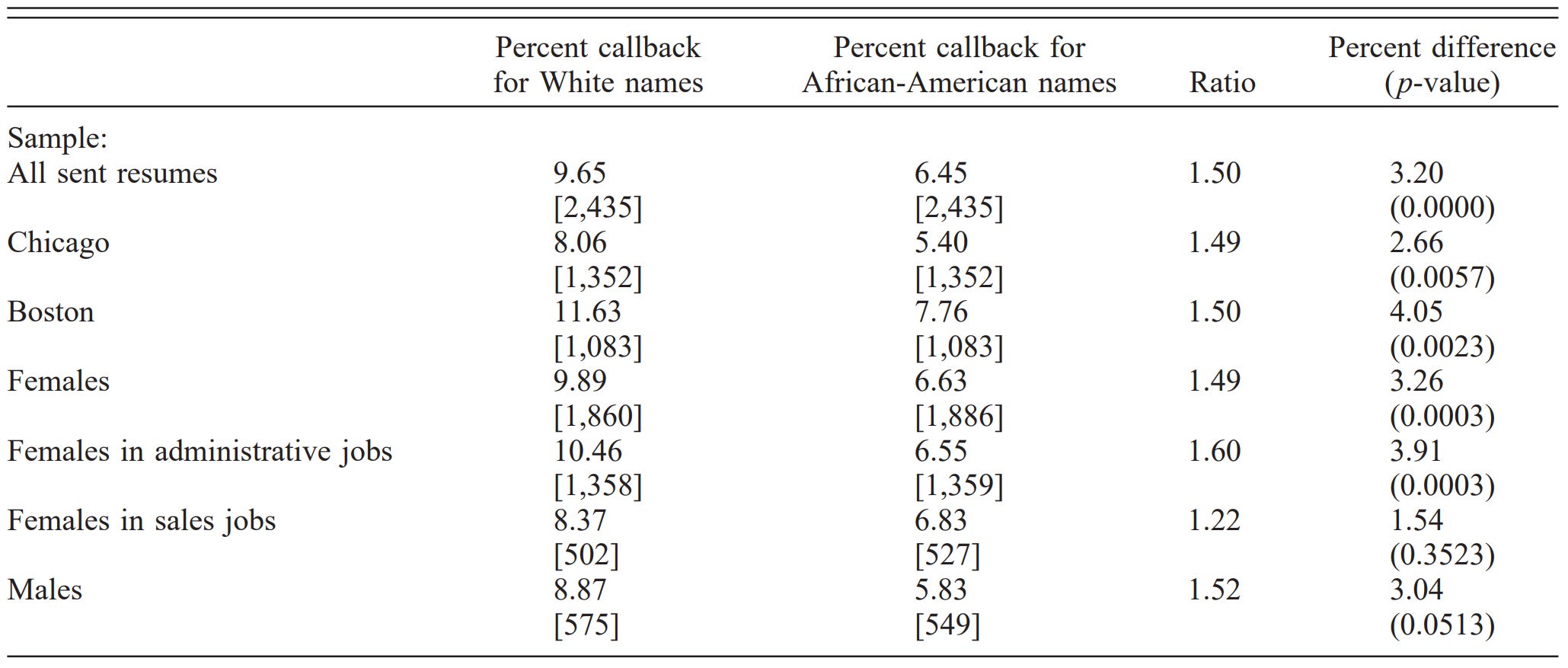 In one of the more popular audit studies, Bertrand & Mullainathan1 tested whether resumes from applicants with names that sounded like they were held by White people (“White names”) ended up receiving more callbacks for interviews than resumes from applicants whose names sounded like they were held by Black people (“Black names”). What they found probably won’t surprise you: