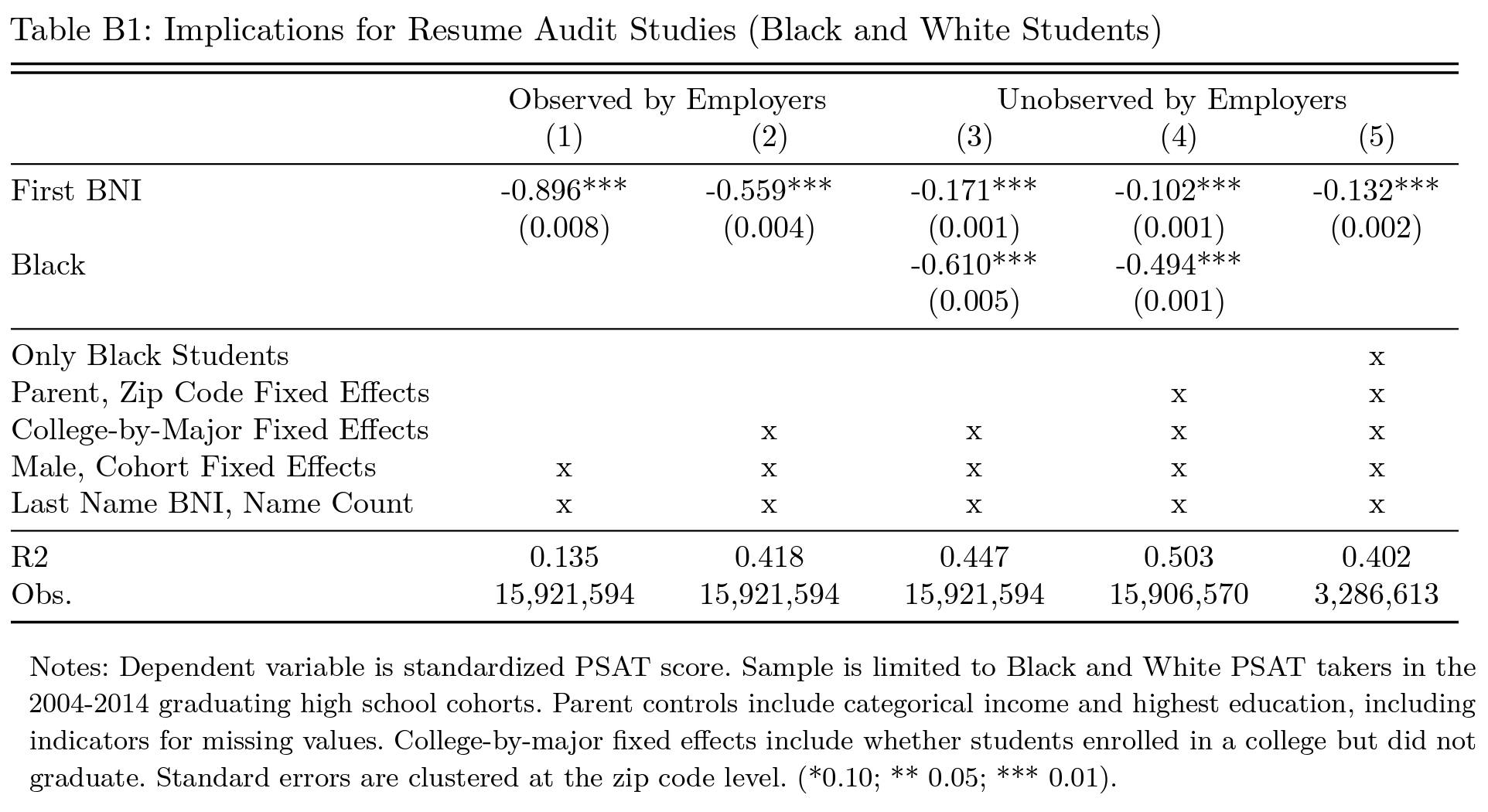 After seeing how unobservable confounding related to audit-manipulated characteristics remains even conditional on numerous covariates on and off of resumes, and how the characteristics used in audit manipulations can affect the values of applicant characteristics for employers, I now know that such a model cannot be estimated because of the presence of too many unknown and inestimable values, including moderation effects. This is non-trivial, because the size and directions of these effects can be economically meaningful so there is real reason to worry. This goes back to the need for the big data approach if you want to get anything done.