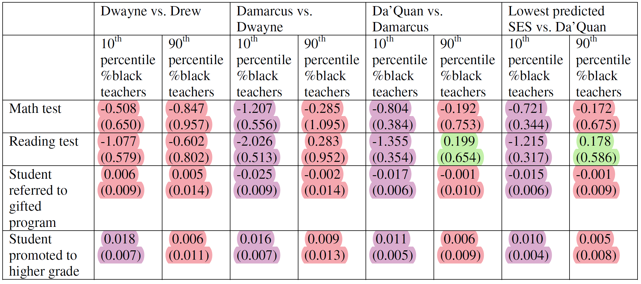A violet highlight indicates a significant result, and when there’s a red next to it, that means the 90-10 interaction was not significant. Green, on the other hand, indicated a significant interaction. It may be notable that in both cases that happened, the 90th percentile results were not significant, suggesting a Black name never became beneficial.
