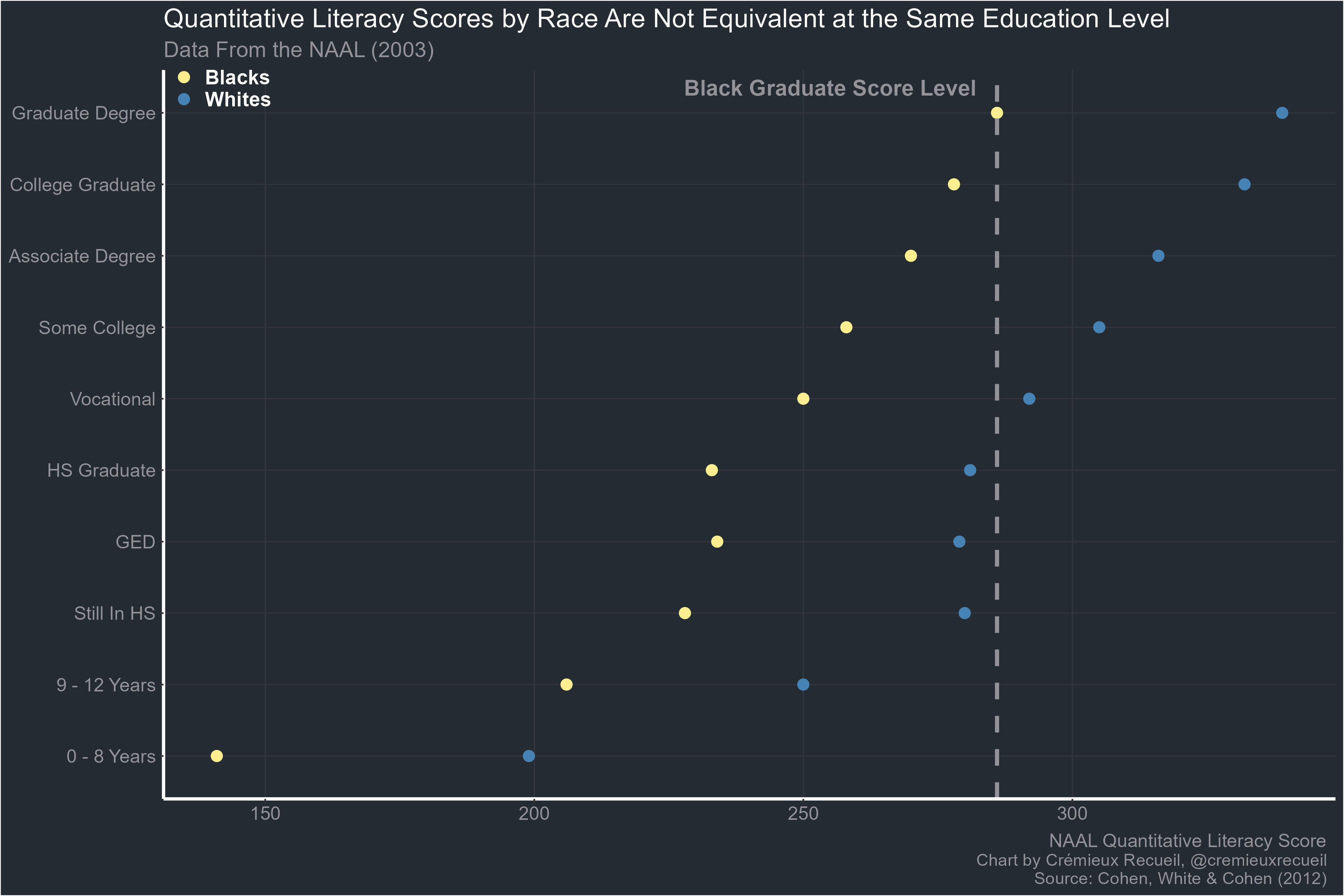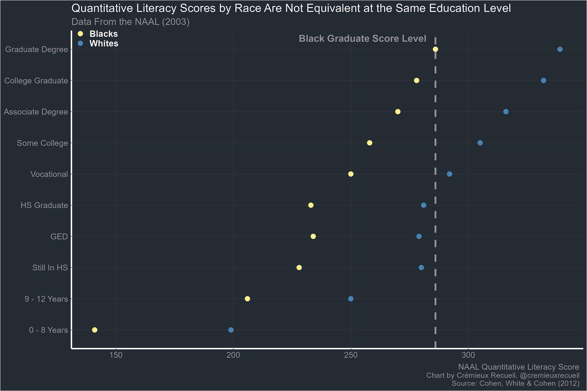 As the graph shows, when they’re equally educated, the average quantitative literacy scores for Blacks and Whites still differ by a large amount. Blacks with graduate degrees score on par with Whites who are only high school graduates. There are many more examples of this replicating, and it replicates across parental education level and within occupations too. It is a natural consequence of classification with thresholds and regression to the mean. It cannot be avoided unless groups have very different skill variances.6