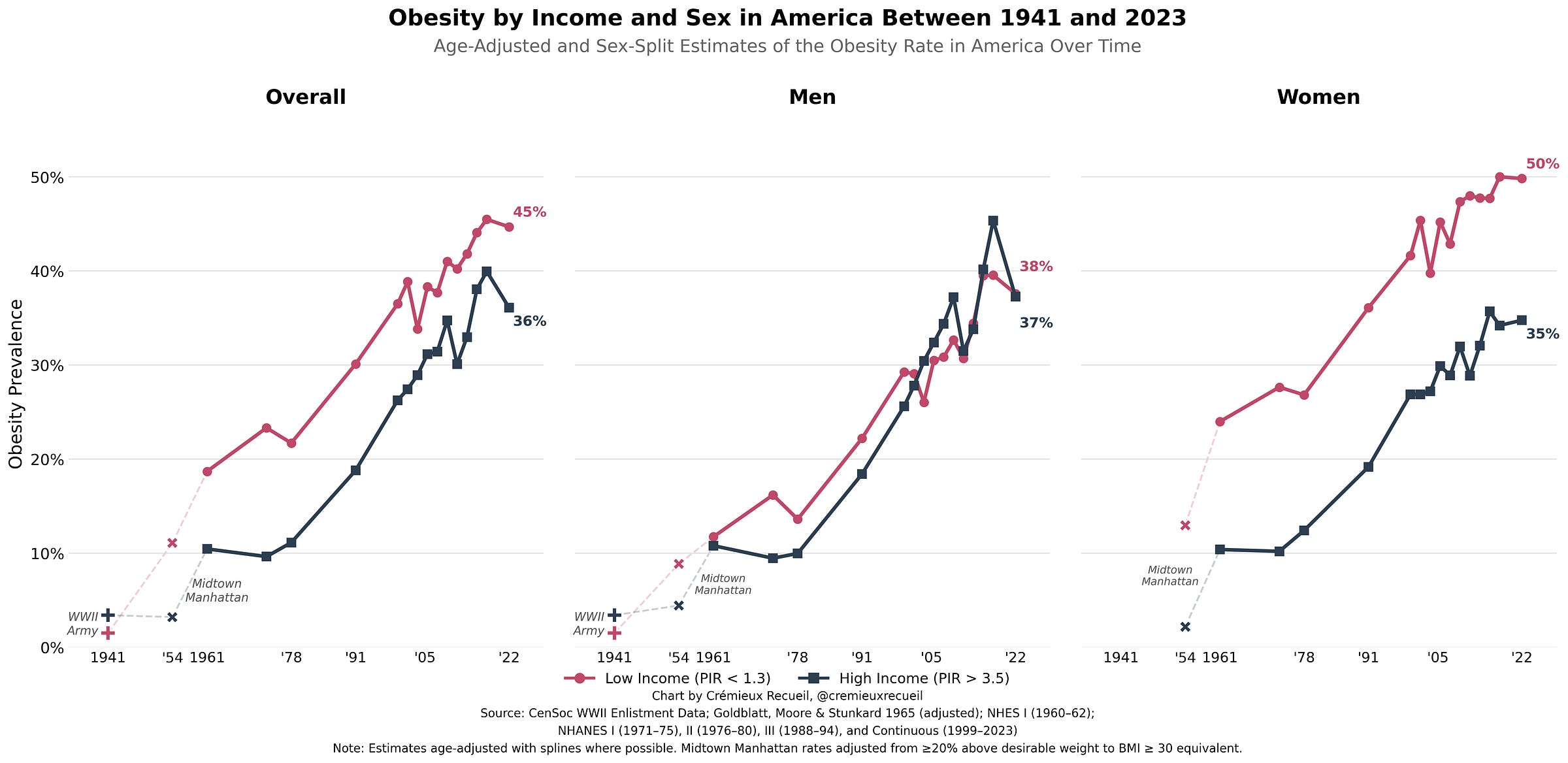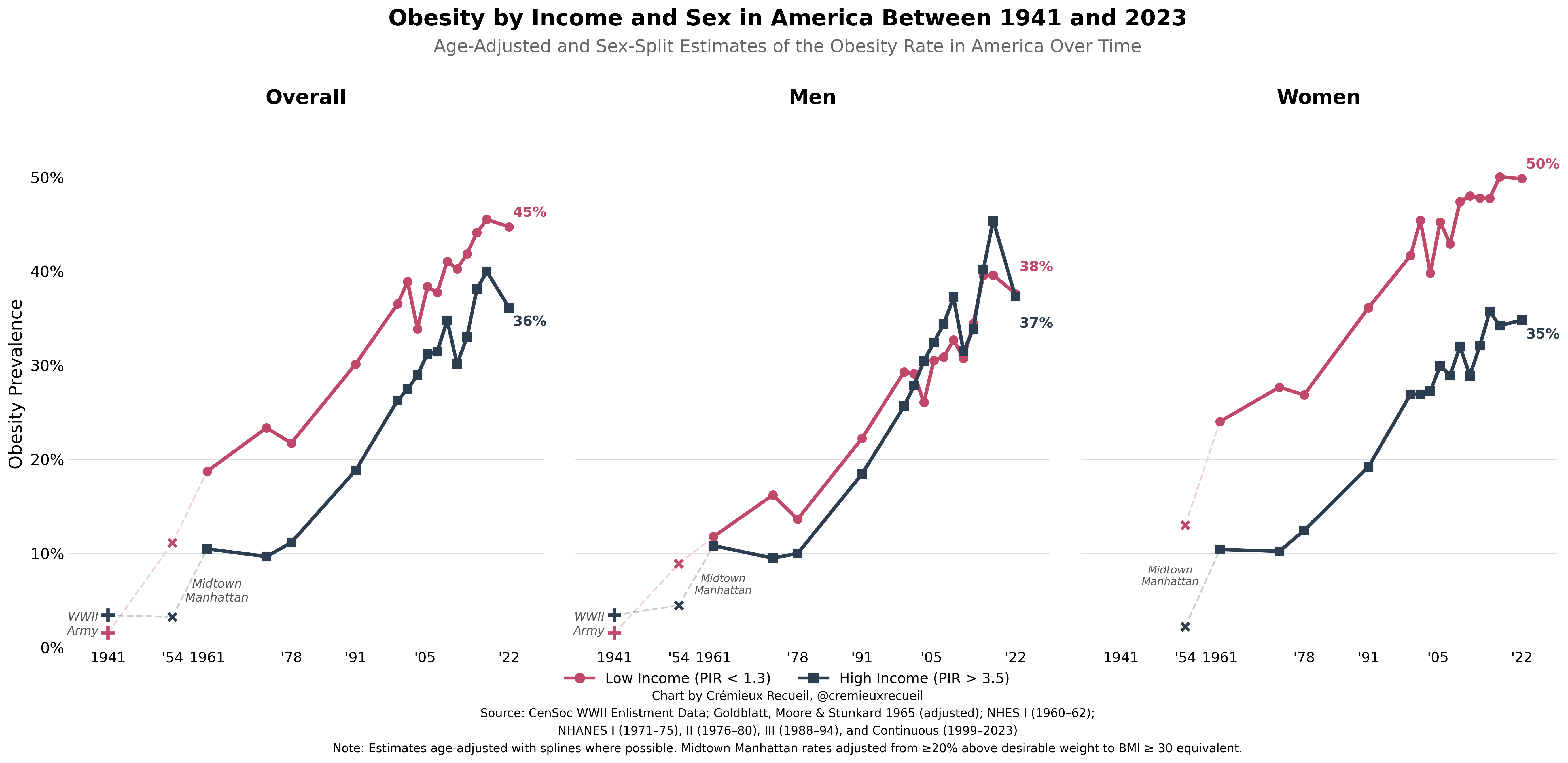 In modern America, what does this relationship even look like? It’s actually not quite ‘poor people are fat.’ In fact, this shows up overall and it has since the Midtown Manhattan study in 1954, but it only does so consistently in women. It did in men for a few decades, but nowadays, poor and rich men have similar obesity rates!