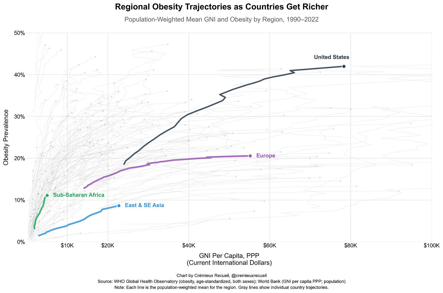 Relative to European countries and the United States, the slope of this relationship tends to be a little shallower for Asian countries and a little steeper for Hispanic and African countries. You can sort-of see that here:
