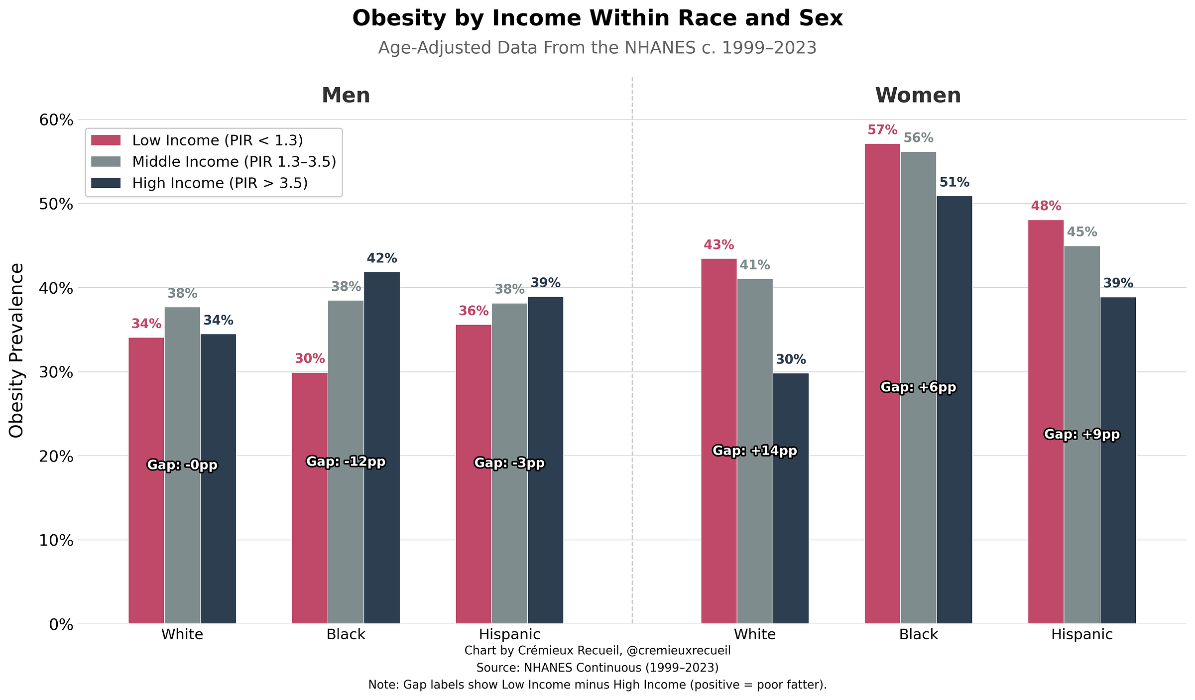 One question is whether this is just due to a race confound, where Blacks and Hispanics tend towards both higher obesity rates and lower being poorer. If you read the above chart carefully, you’ll realize this can’t be the case in general, and could only be the case within a given sex, and it is! Take a look: